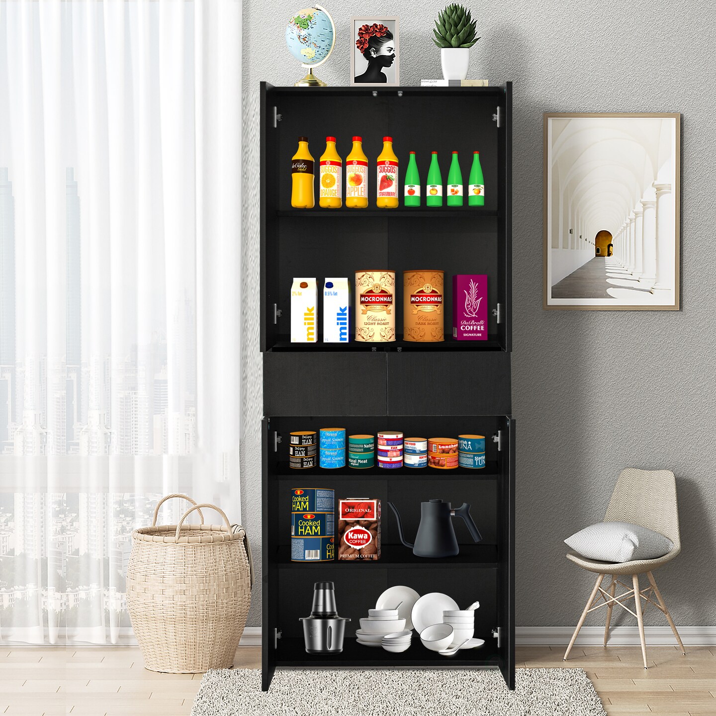 66-Inch Multi-Functional Finish Kitchen Pantry Cabinet with 4 Doors, 3 Adjustable Shelves, 2 Cabinets with 1 Drawer – Elegant Freestanding Farmhouse Storage for Kitchen, Dining and Living Room
