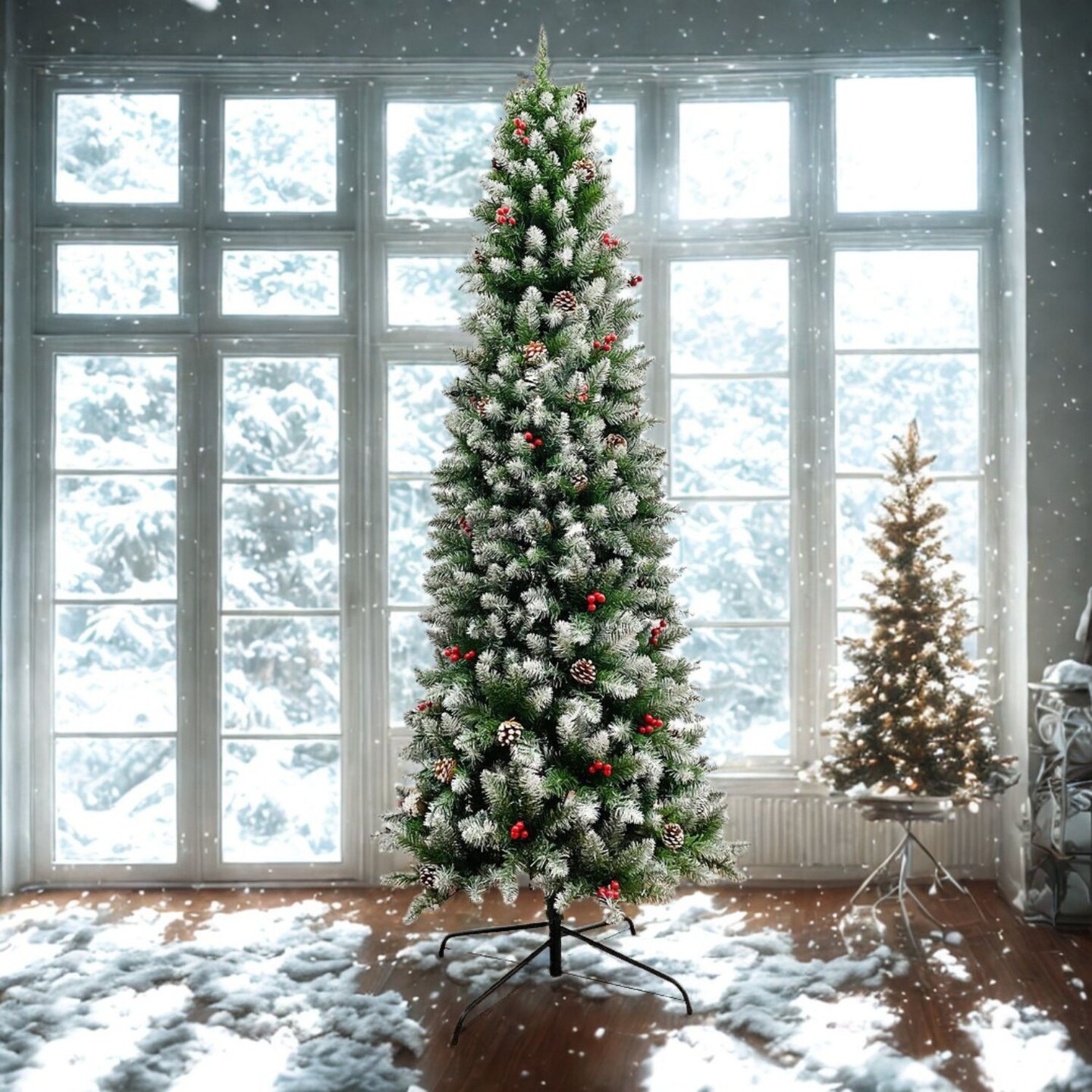 6ft Frosted Norwood Pencil Pine Christmas Tree with Pine Cones Red Berries and Metal Stand