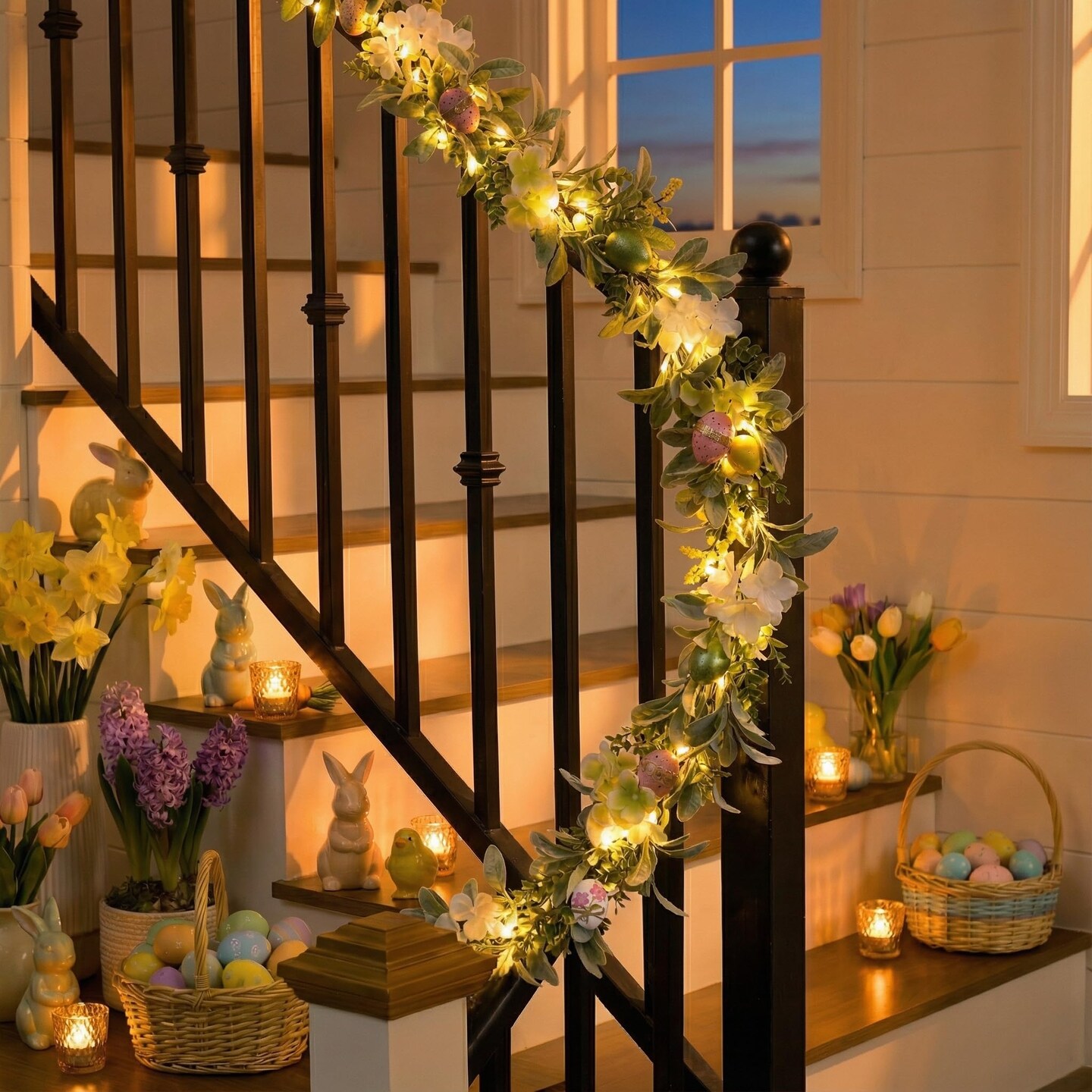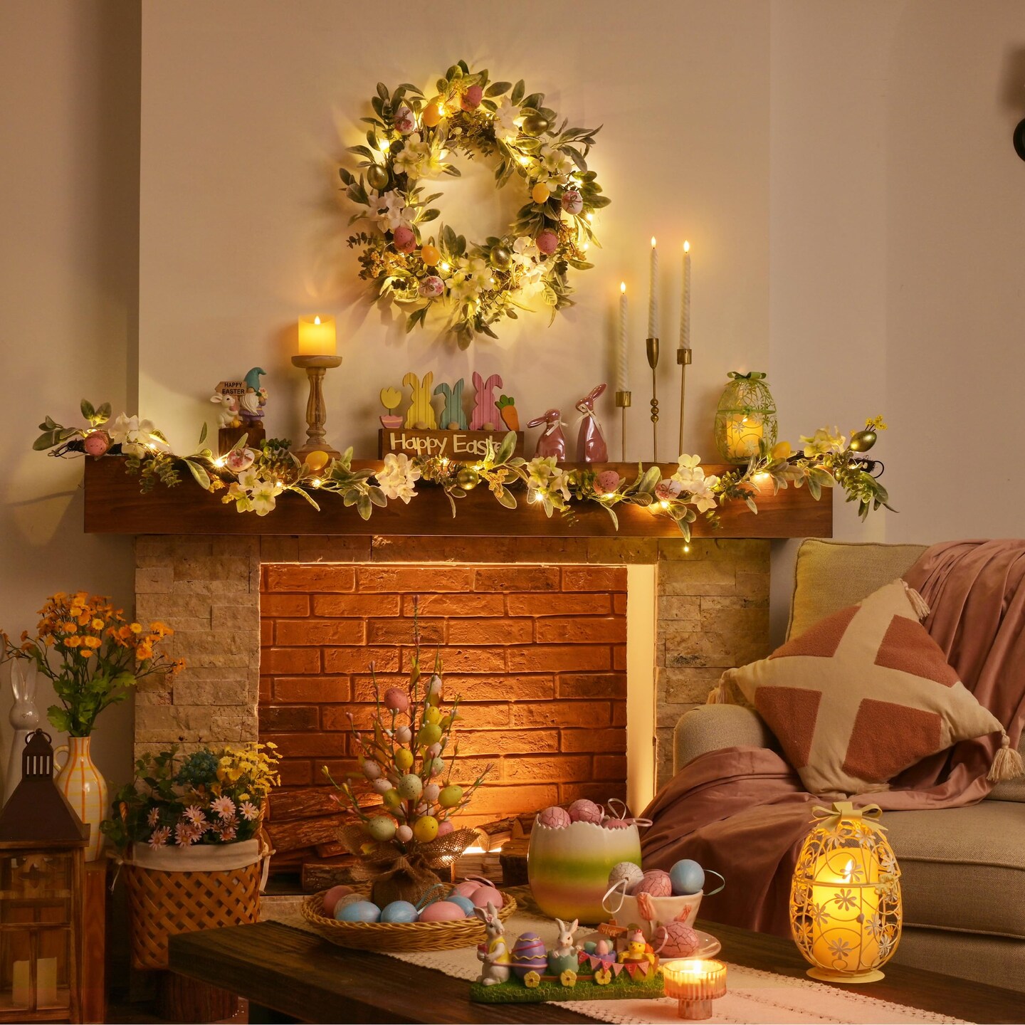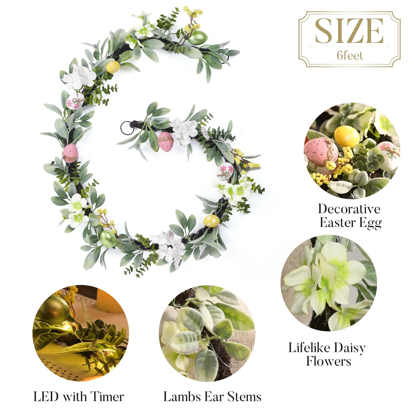 6ft Lighted Easter Garland for Mantle Fireplace, Artificial Spring Flower Garland with Pastel Eggs & Daisy Flower, Artificial Lambs Ear Greenery Farmhouse Easter Decor for Home Indoor