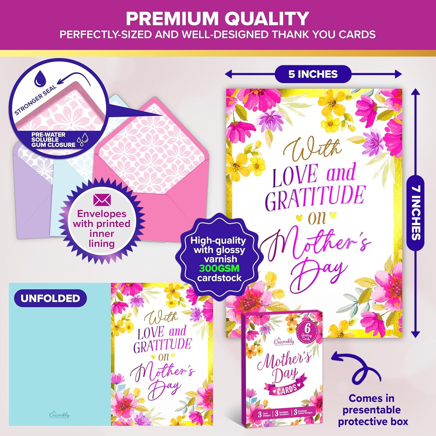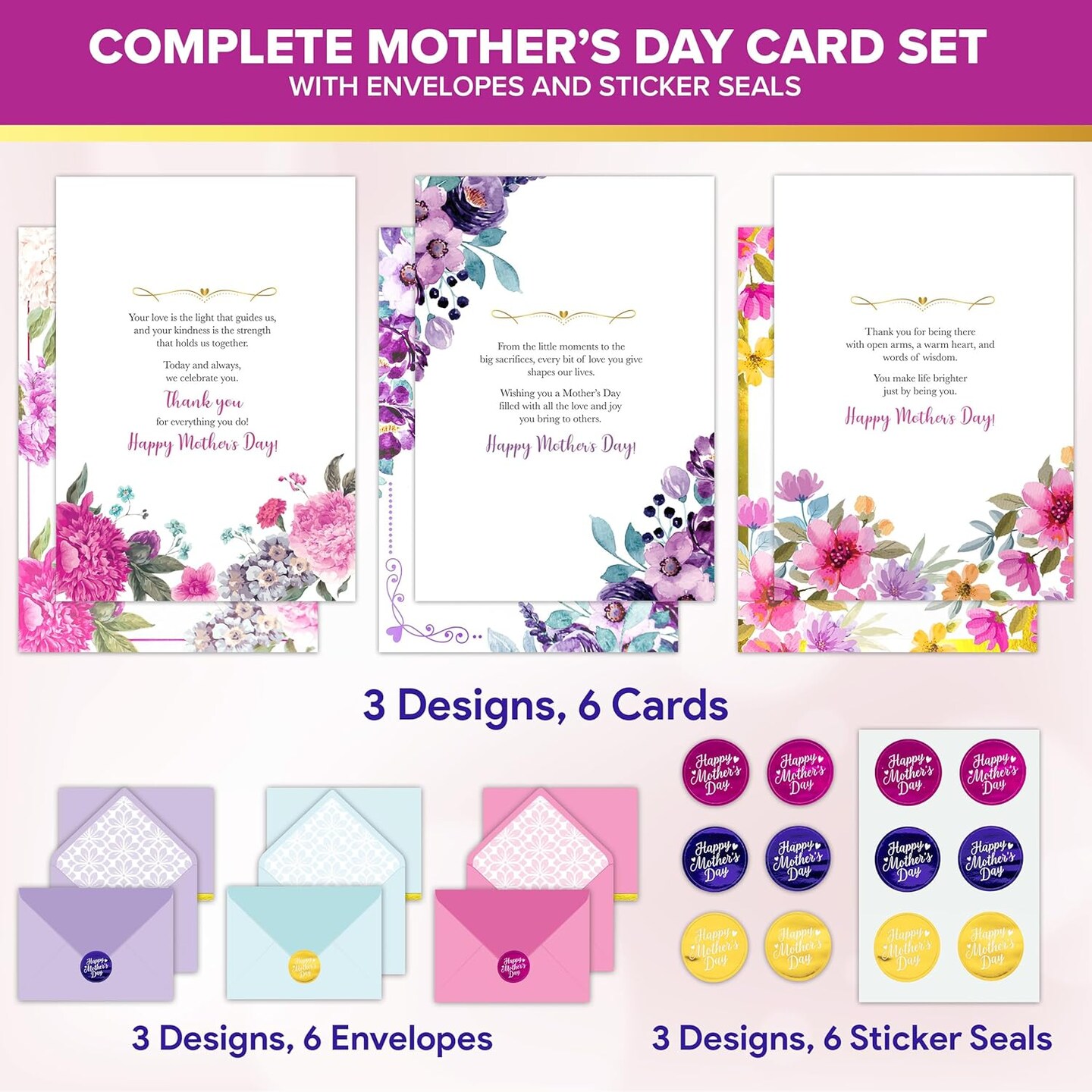 6-Pack Foiled 5x7 in Mother’s Day Cards with Envelopes & Stickers – 3 Elegant Floral Designs, Printed Messages Inside