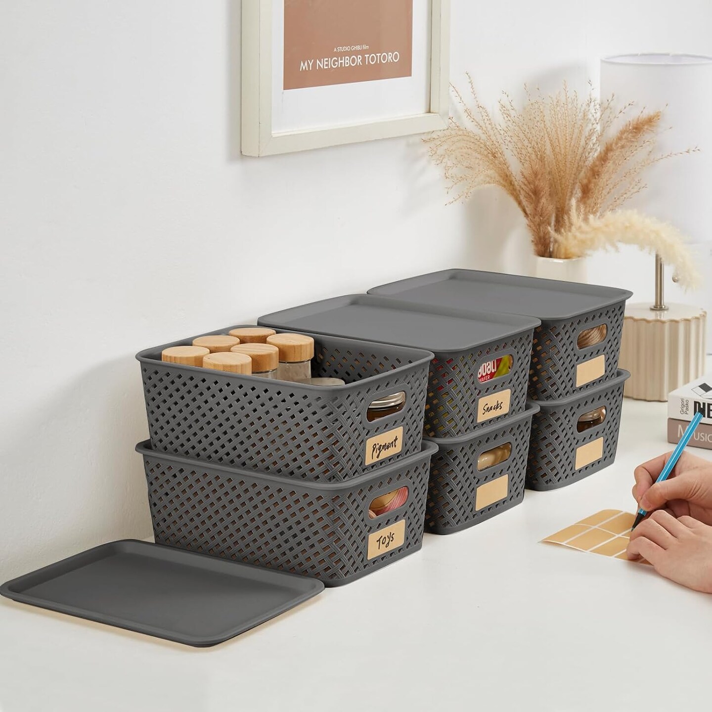 6-Pack Small Plastic Twill Woven Storage Baskets with Lids - Gray