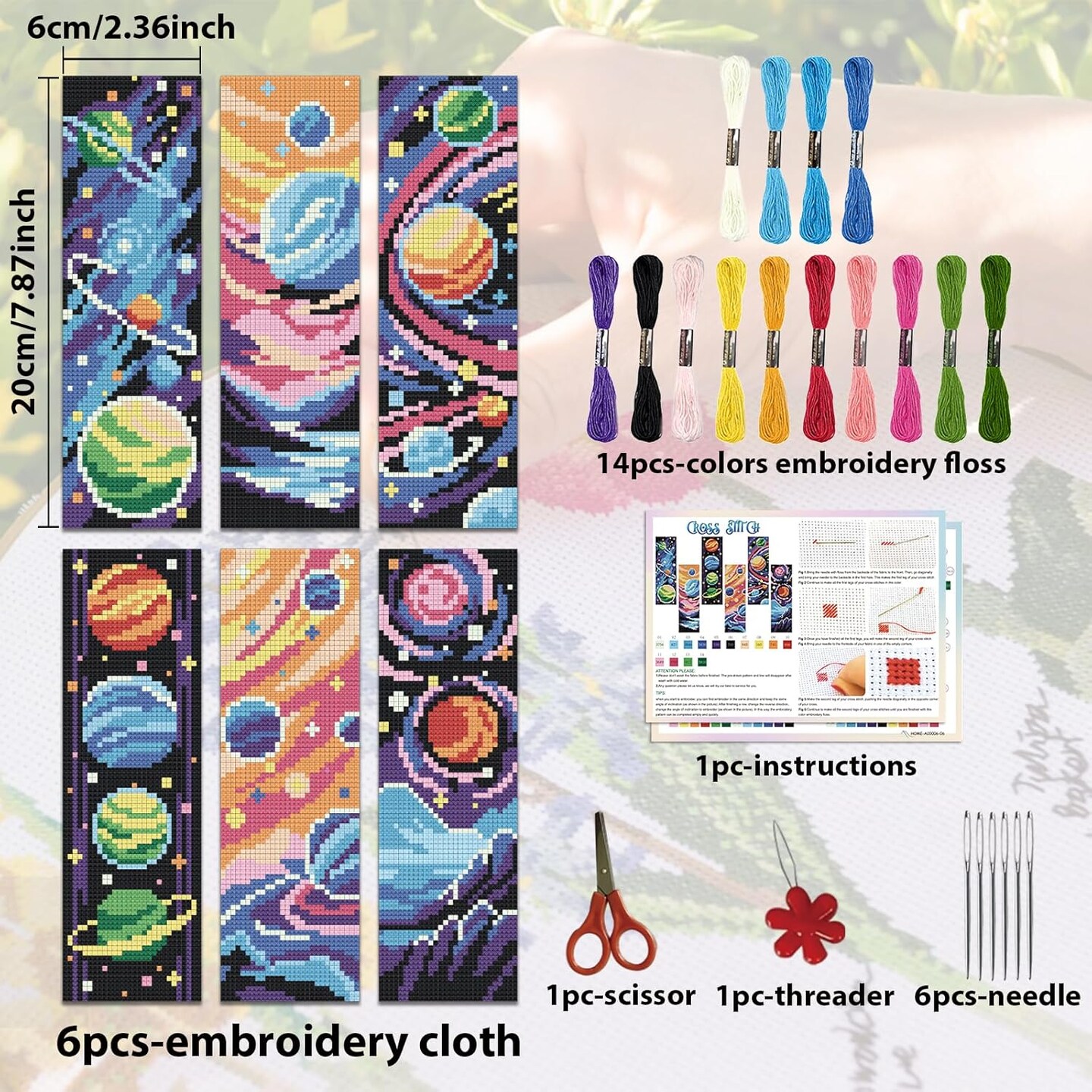 6PCS Cosmic Planet Cross Stitch Bookmark Kit – Beginner-Friendly DIY Stamped Embroidery for Adults, Handcrafted Bookmarks with Instructions