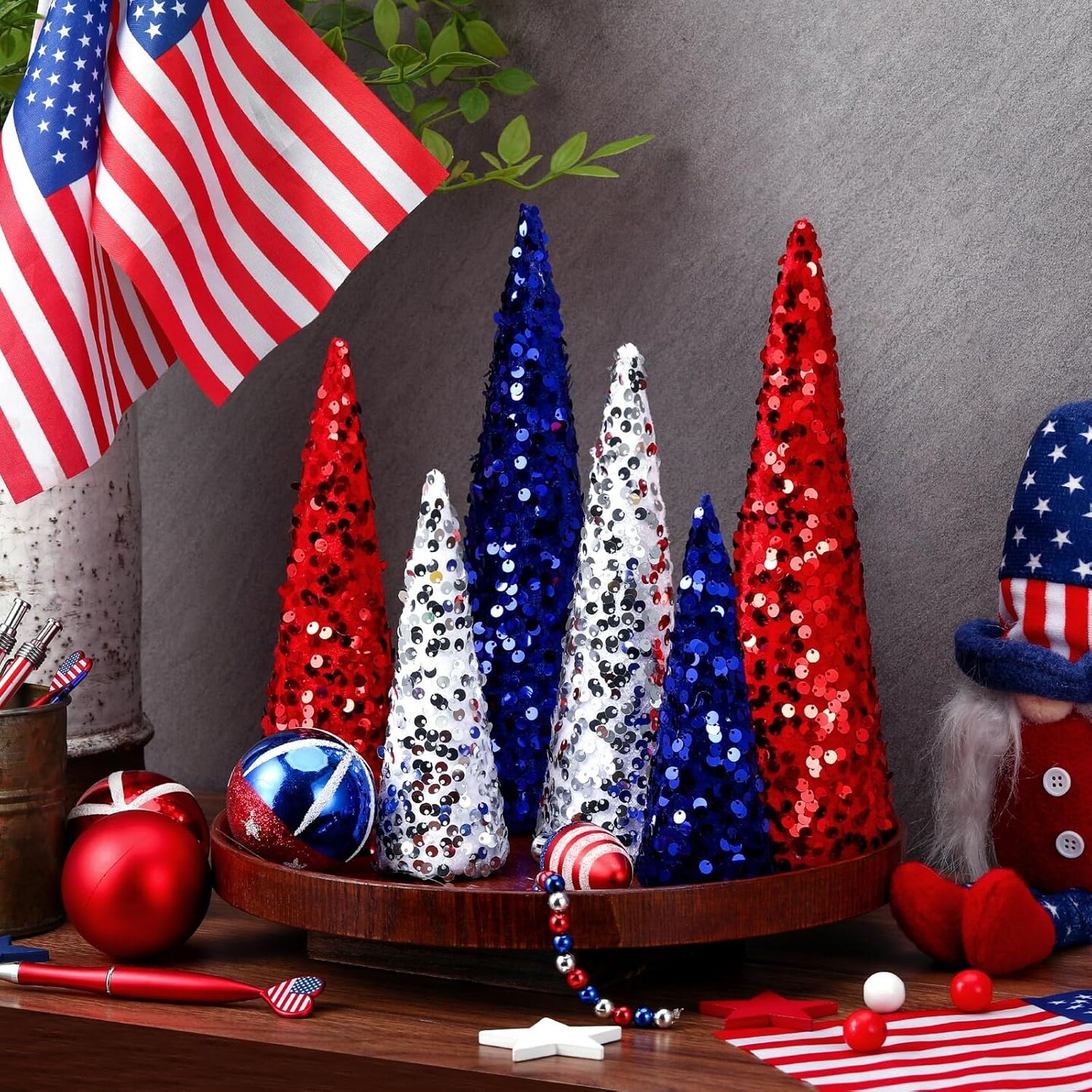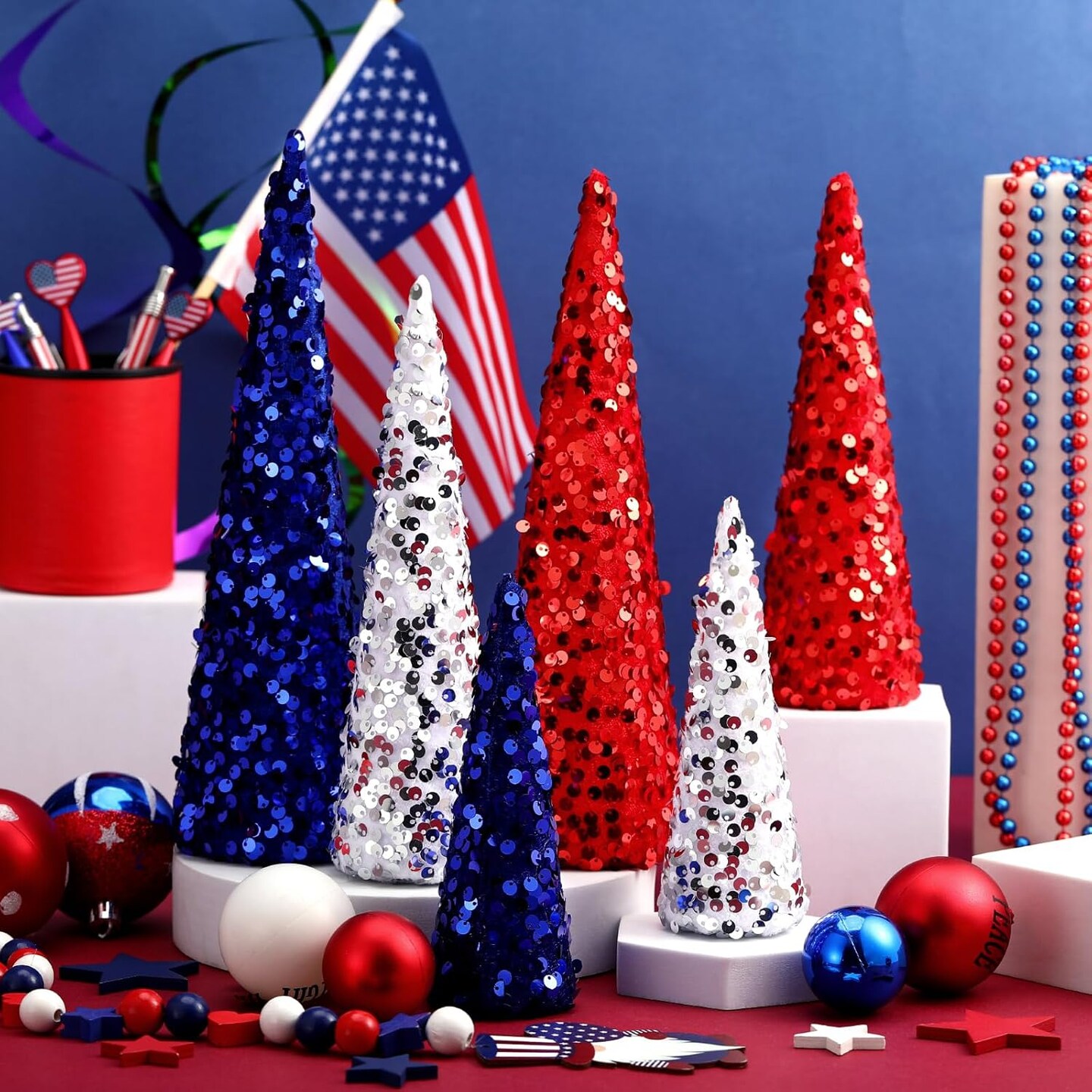 6-Piece 4th of July Red, White & Blue Glitter Cone Trees – Patriotic Table Centerpiece Decorations for Independence Day, Memorial Day, Veterans Day, Party, Home, Kitchen, and Shelf Display