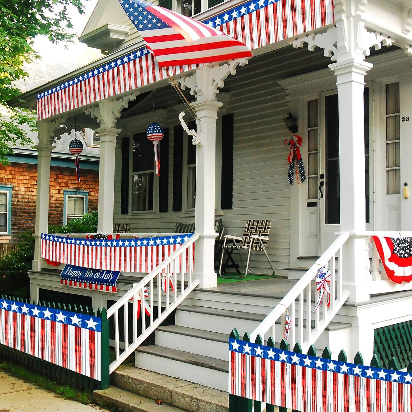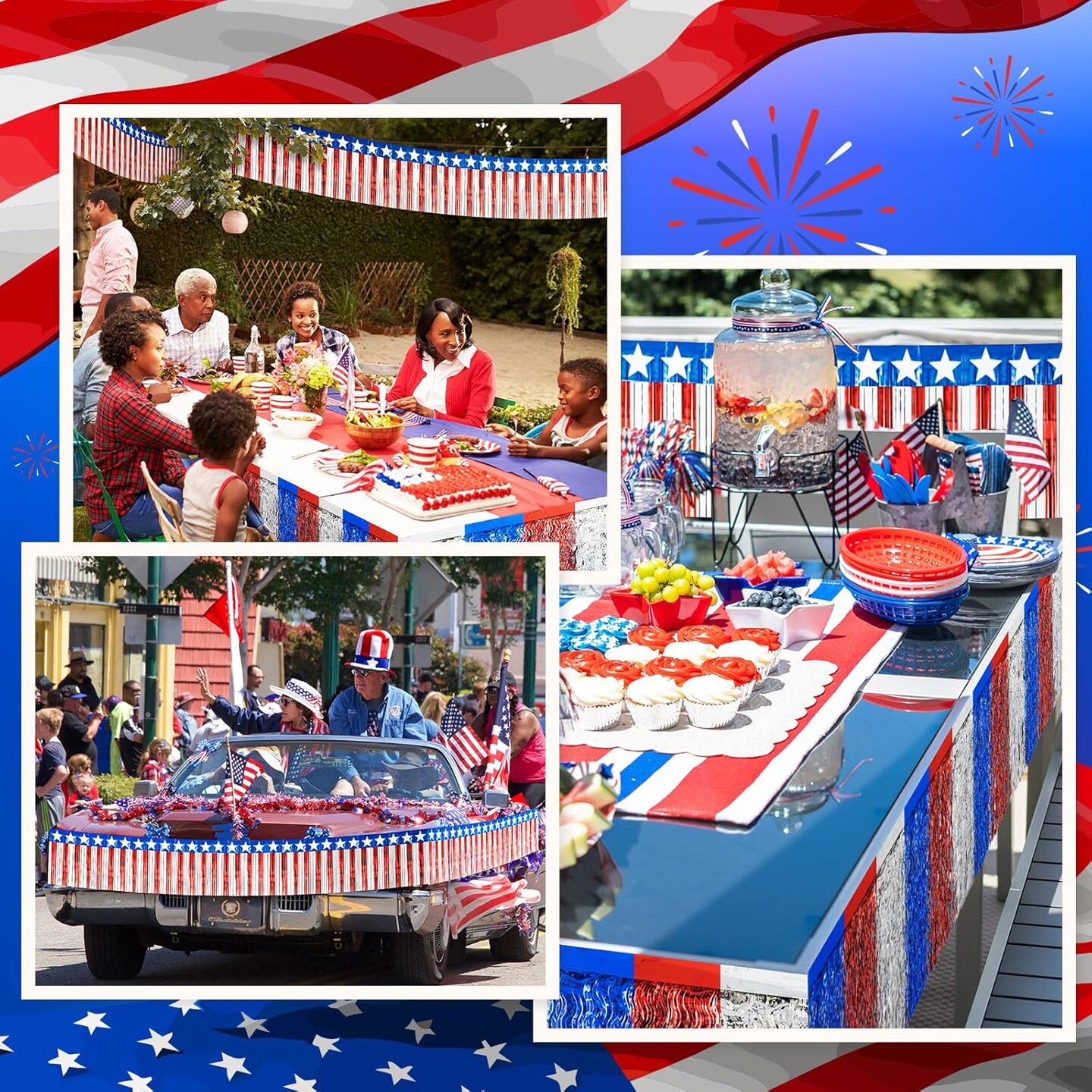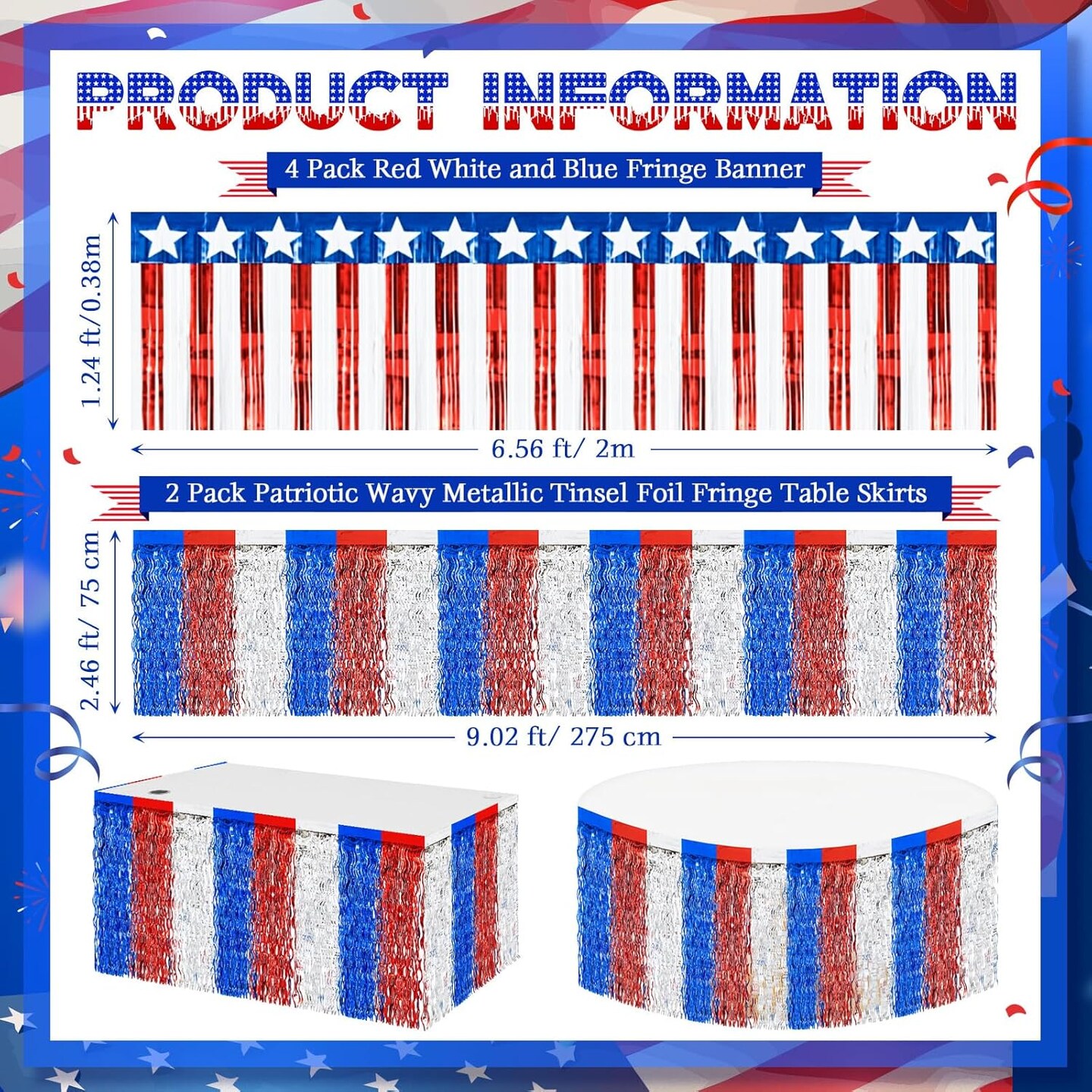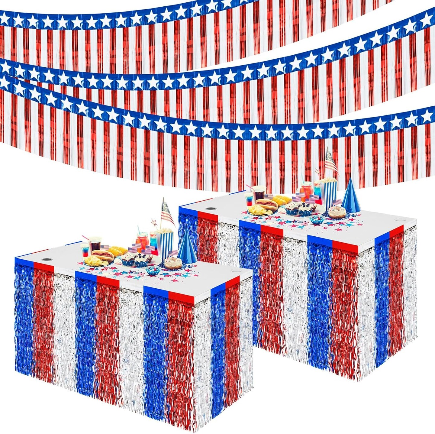 6-Piece 4th of July Table Skirts & Fringe Decorations – Patriotic Red, White & Blue Tinsel Foil Skirt & Banner Set for Independence Day, Memorial Day, Veterans Day & Labor Day Parties