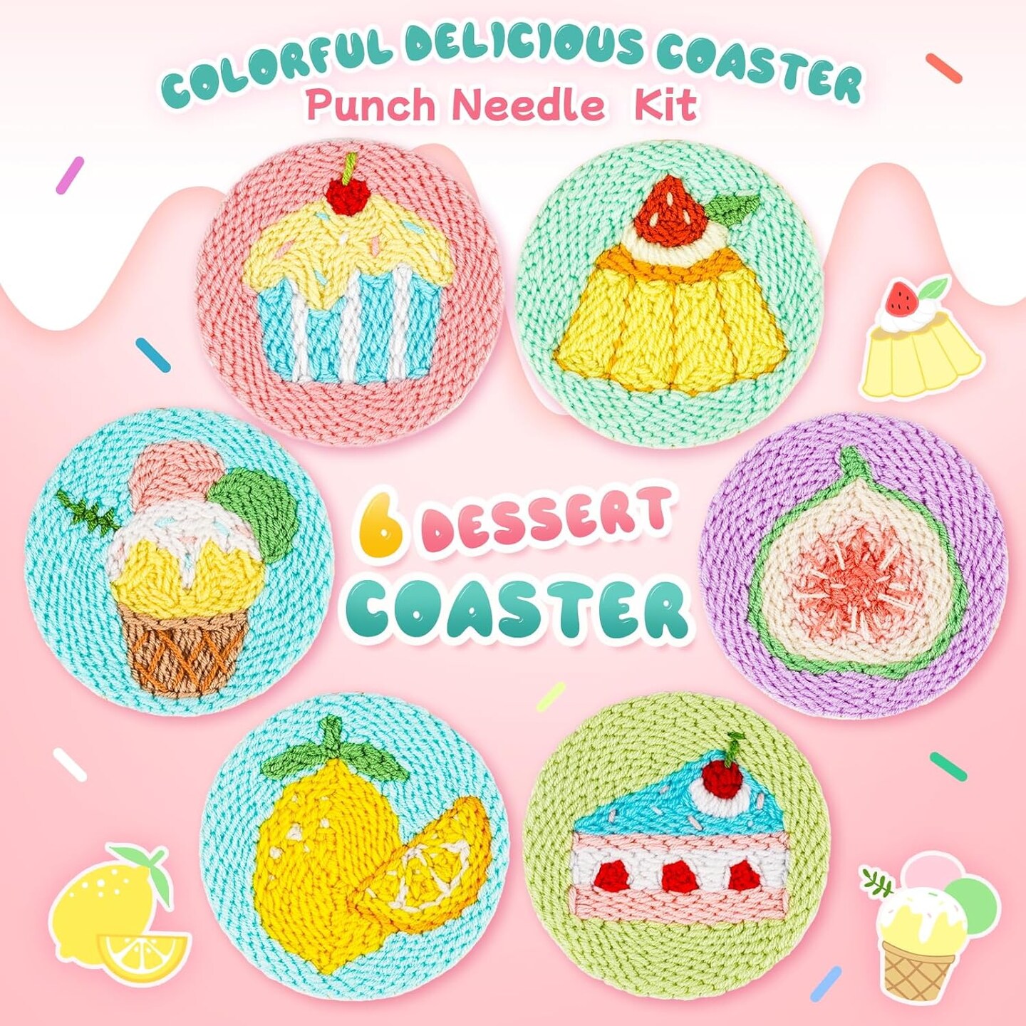 6-Piece Fruit & Dessert Punch Needle Kit – DIY Embroidery Set for Beginners with Needles, Curved Scissors, Hoop, Yarn & Storage Box, Step-by-Step Tutorial Videos, Craft Kit for Adults & Kids