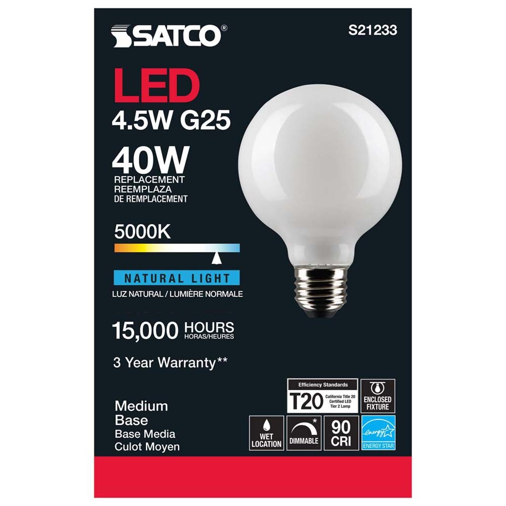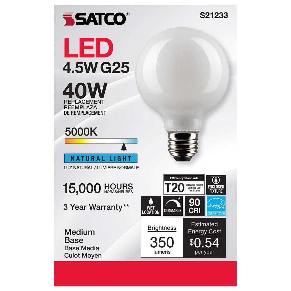 6Pk - Satco 4.5w G25 Globe LED 5000K Medium Base White Dimmable - 40w equiv