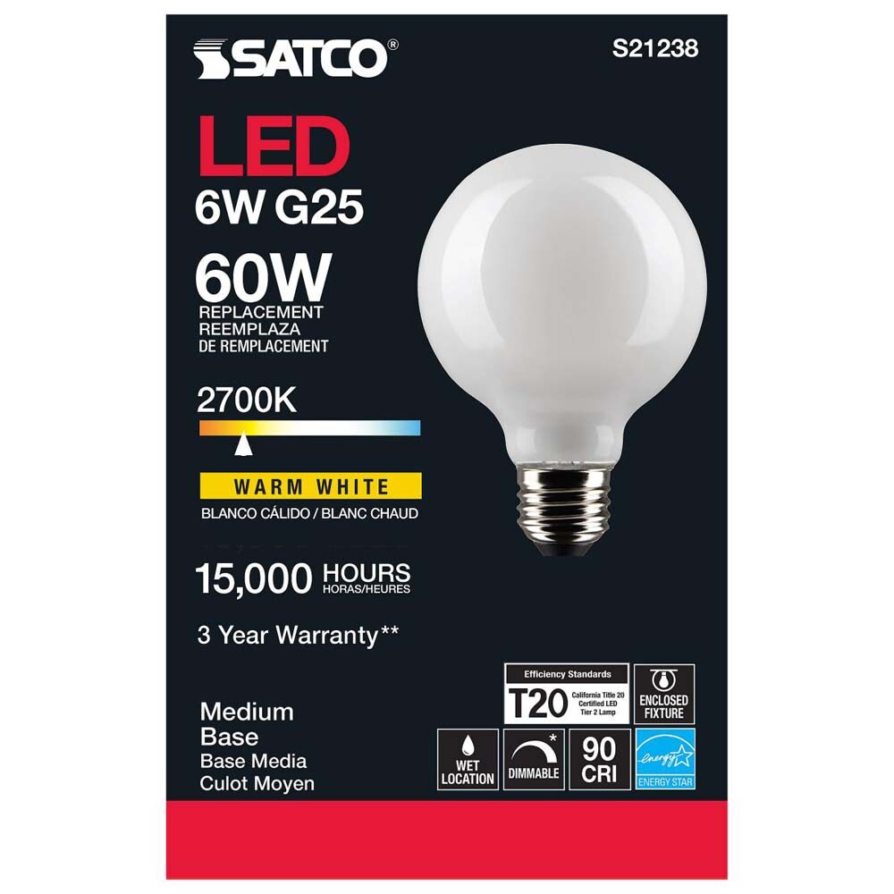 6Pk - Satco 6w G25 Globe Filament LED 2700K E26 Base White Dimmable - 60w equiv