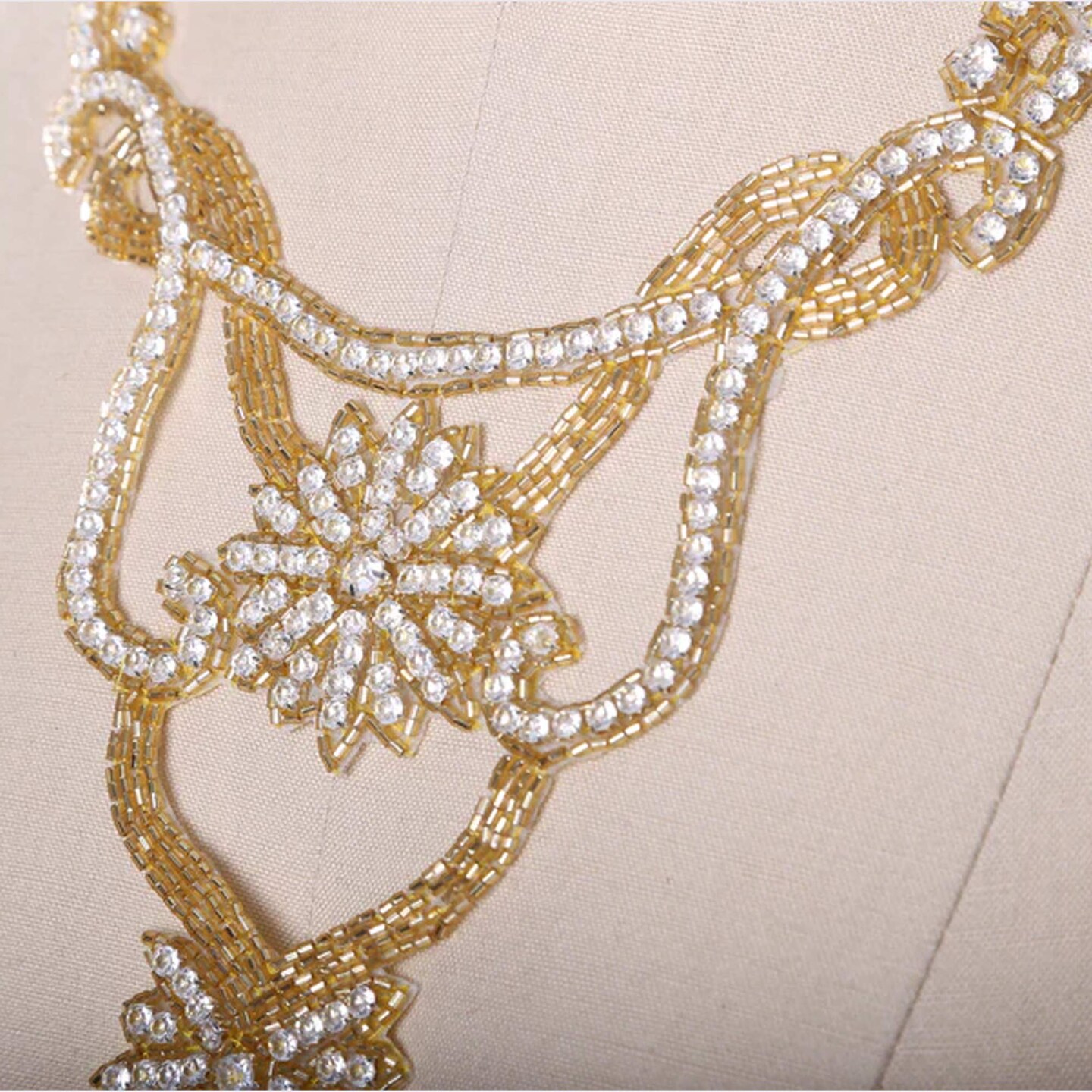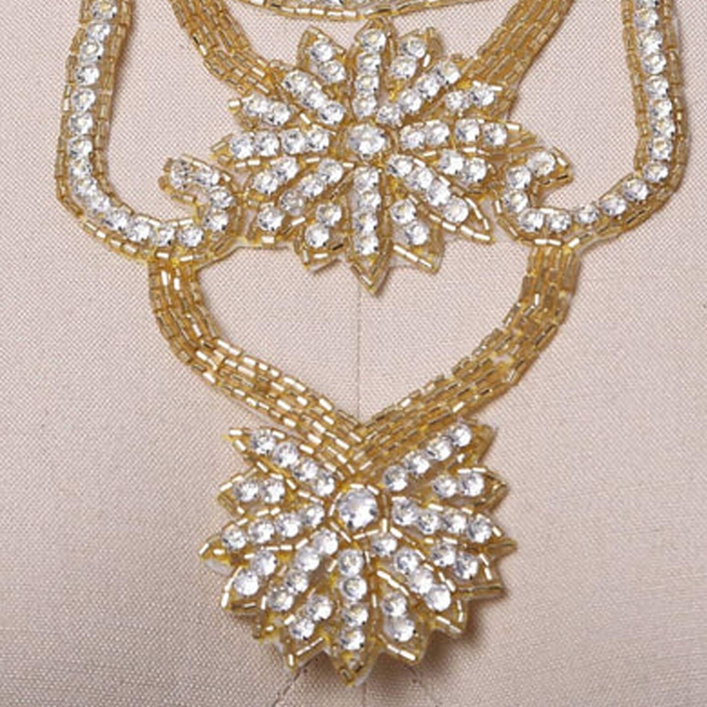 7" x 5" Gold Double Flower Rhinestone Iron On Neck Applique for Dresses and Costumes