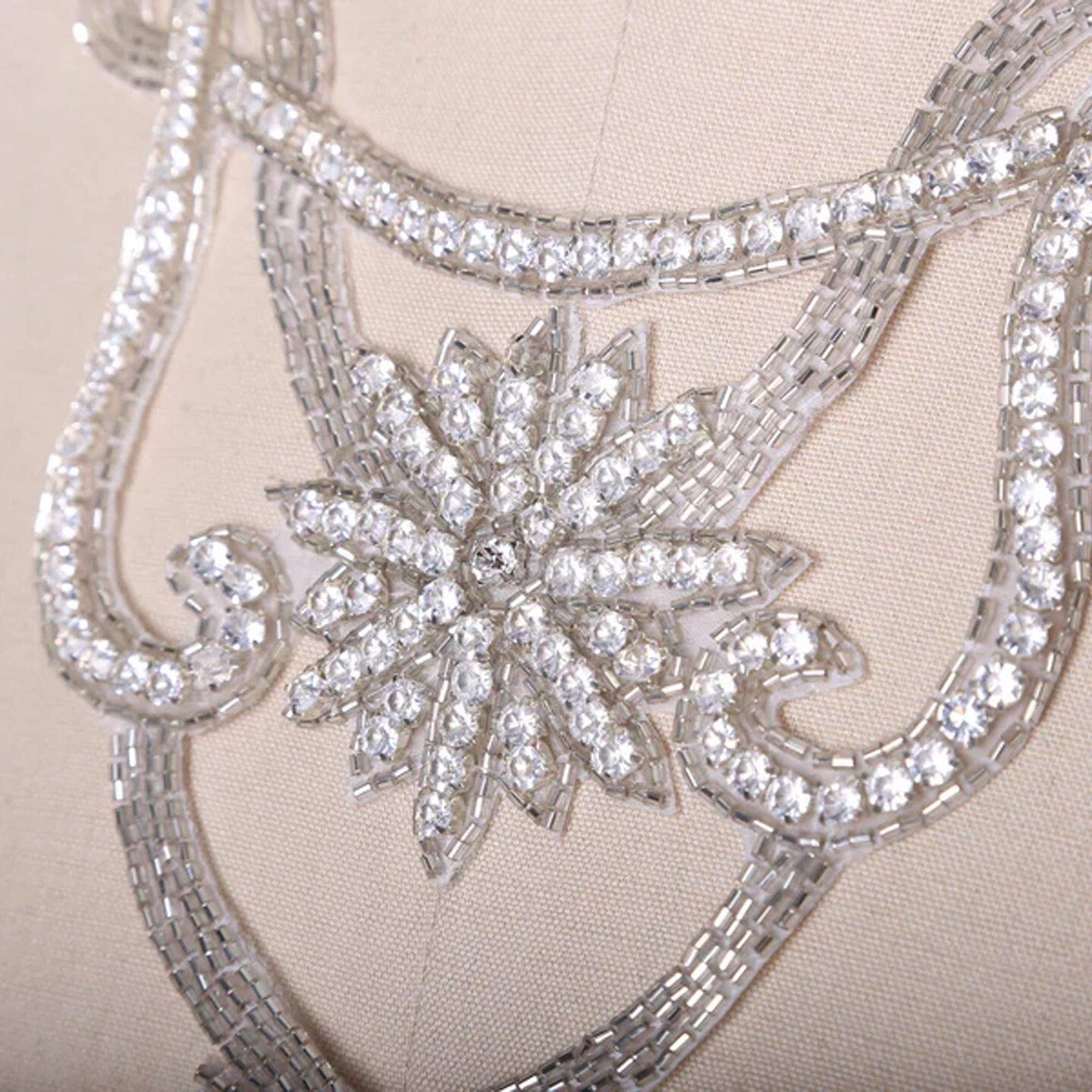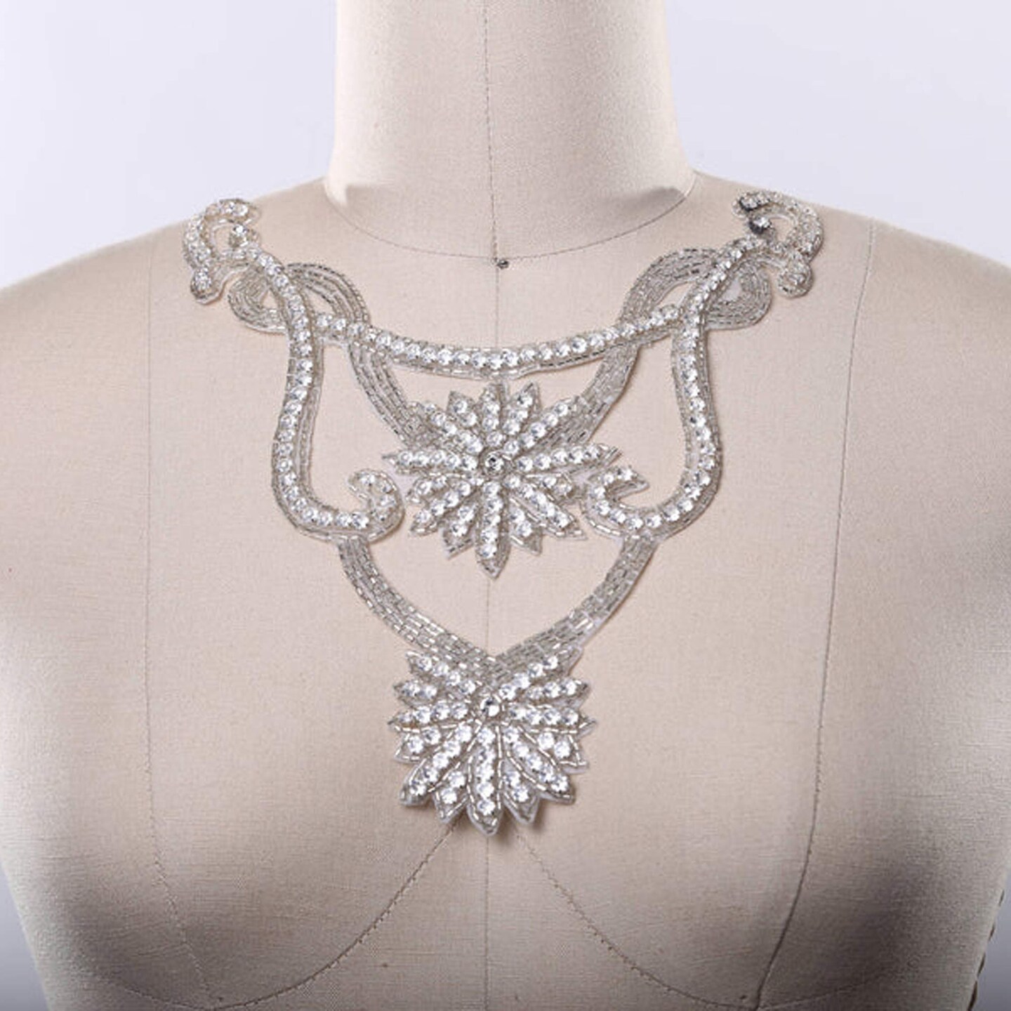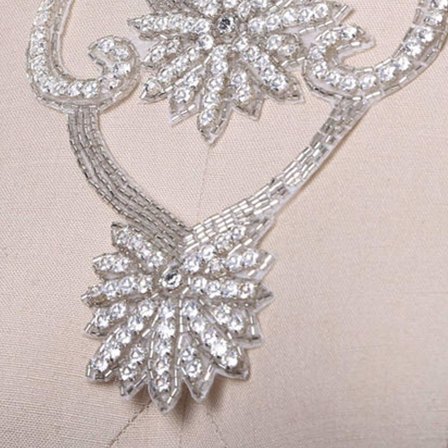 7" x 5" Silver Double Flower Rhinestone Iron On Neck Applique for Dresses and Gowns