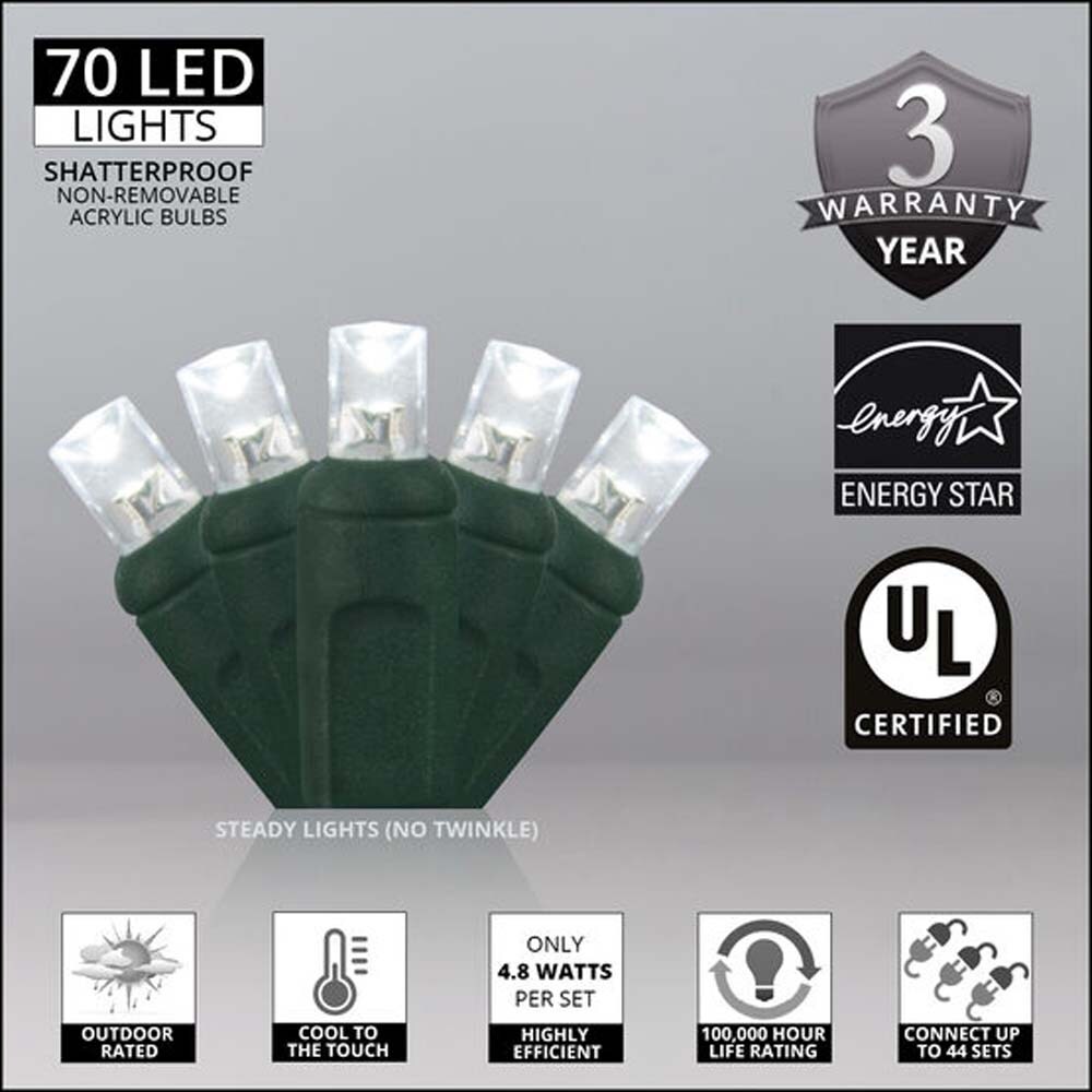 70 Cool White 5mm LED Christmas Lights, Green Wire, 4" Spacing