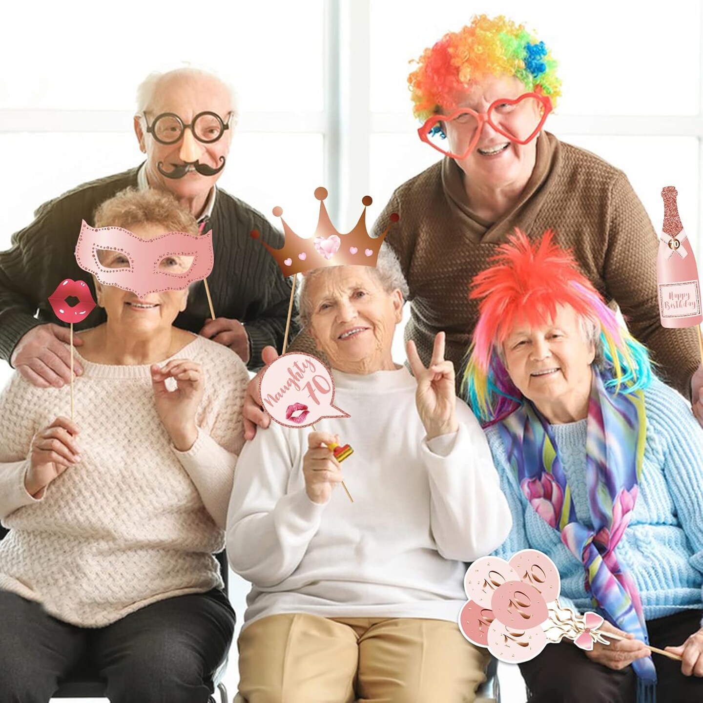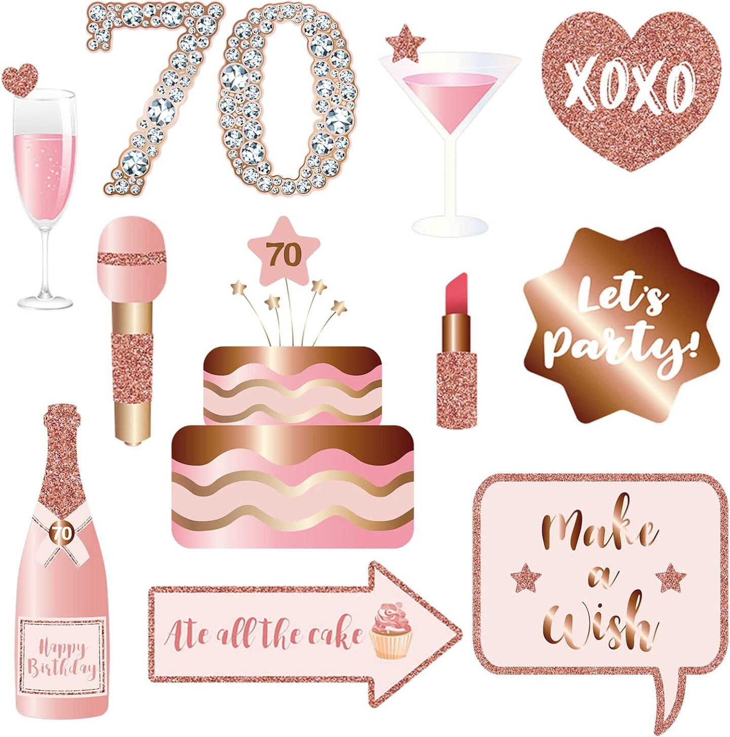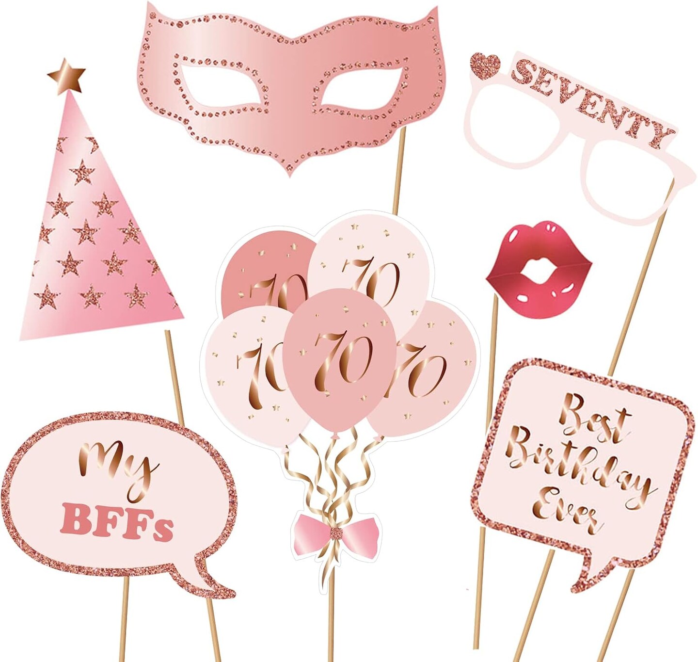 70th Birthday Party Photo Booth Props and Signs, Rose Gold 70 Birthday Party Selfie Props Kit with Sticks for Women
