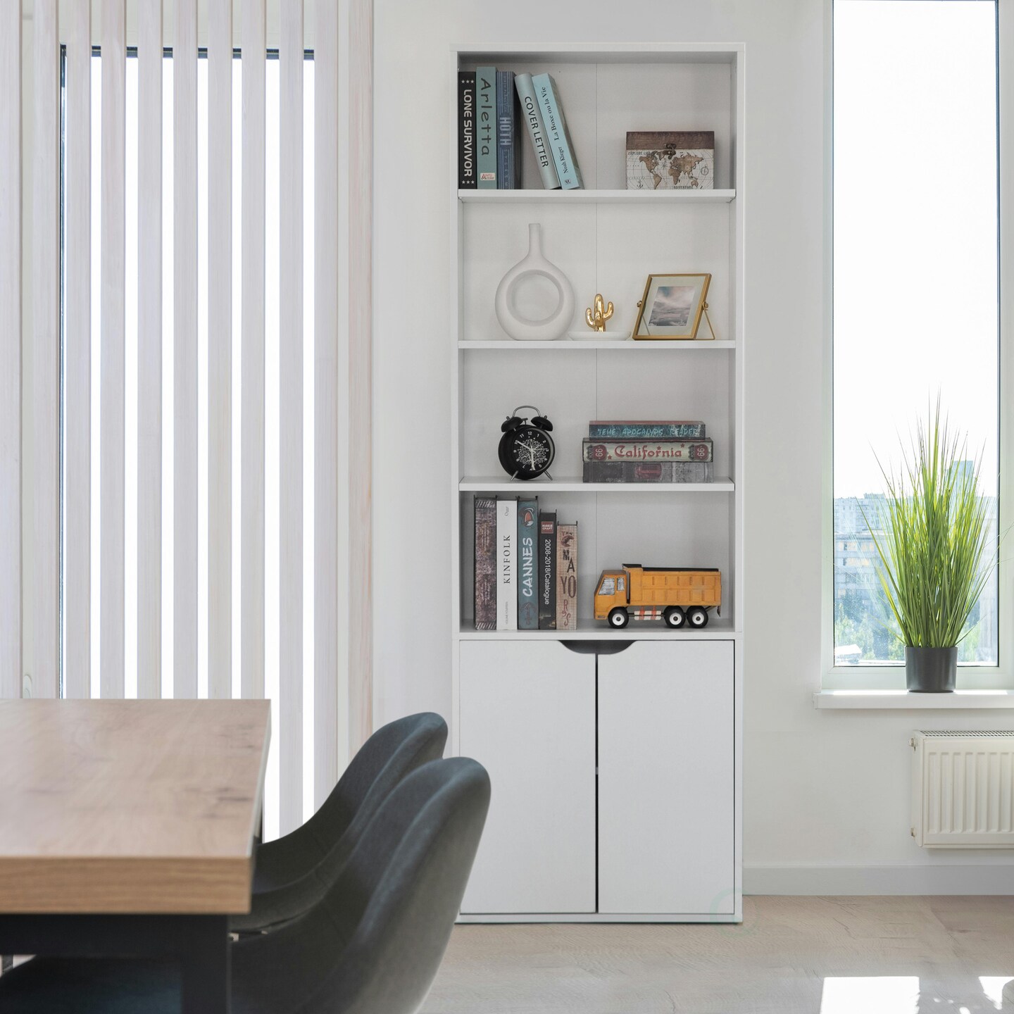 71 Inches Multi Purpose White 4 Tier Open Book Shelf and Bookcases with 2 Doors Storage Cabinet and 1 Adjustable Shelf - Ideal for Home Office, Living Room, Classroom, Study Room