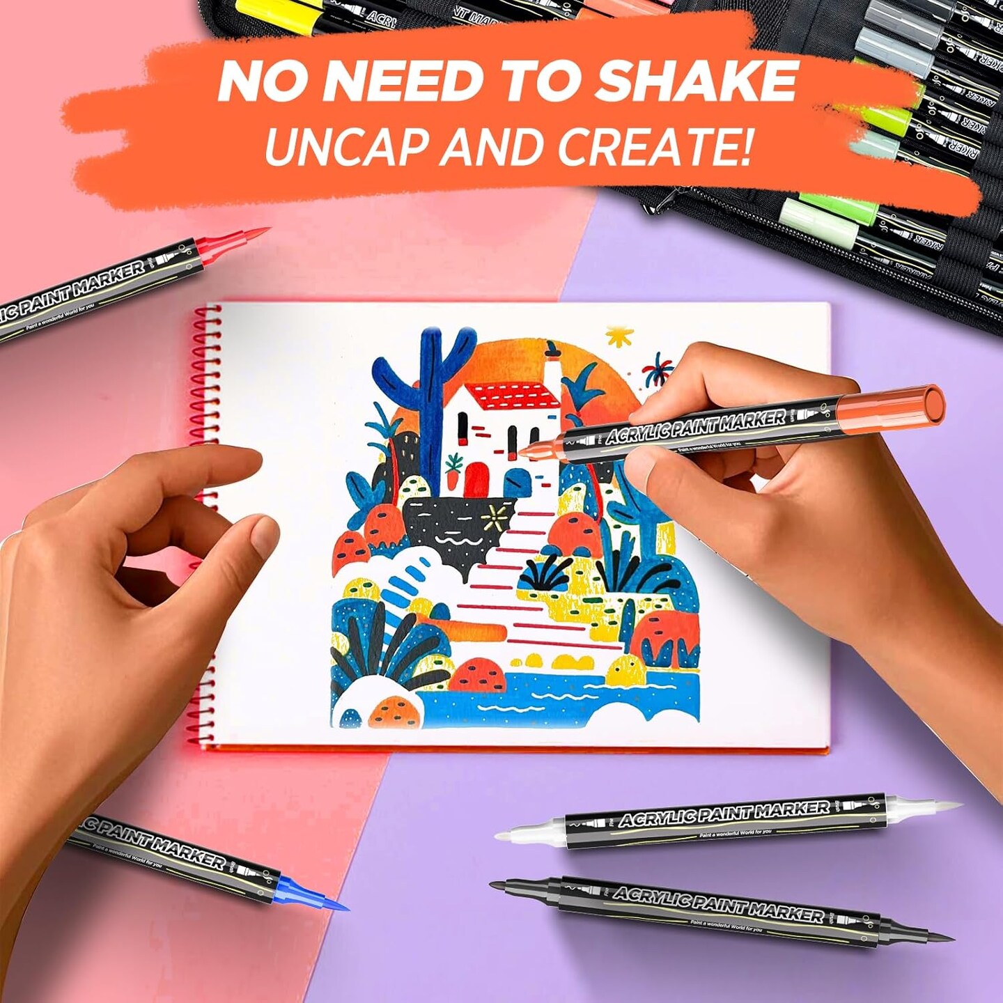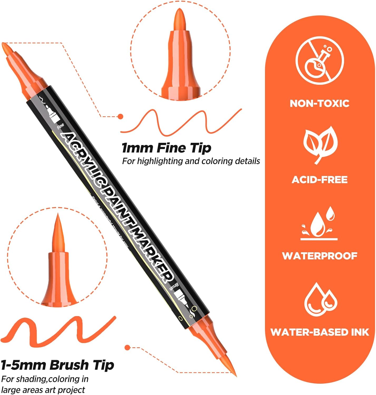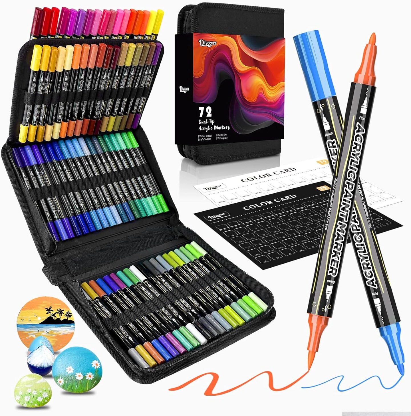 72 Colors Acrylic Paint Pens – Dual Tip Brush & Fine Tip Markers for Rock Painting, Wood, Canvas, Stone, Glass, Ceramic, DIY Crafts, Professional Art Supplies