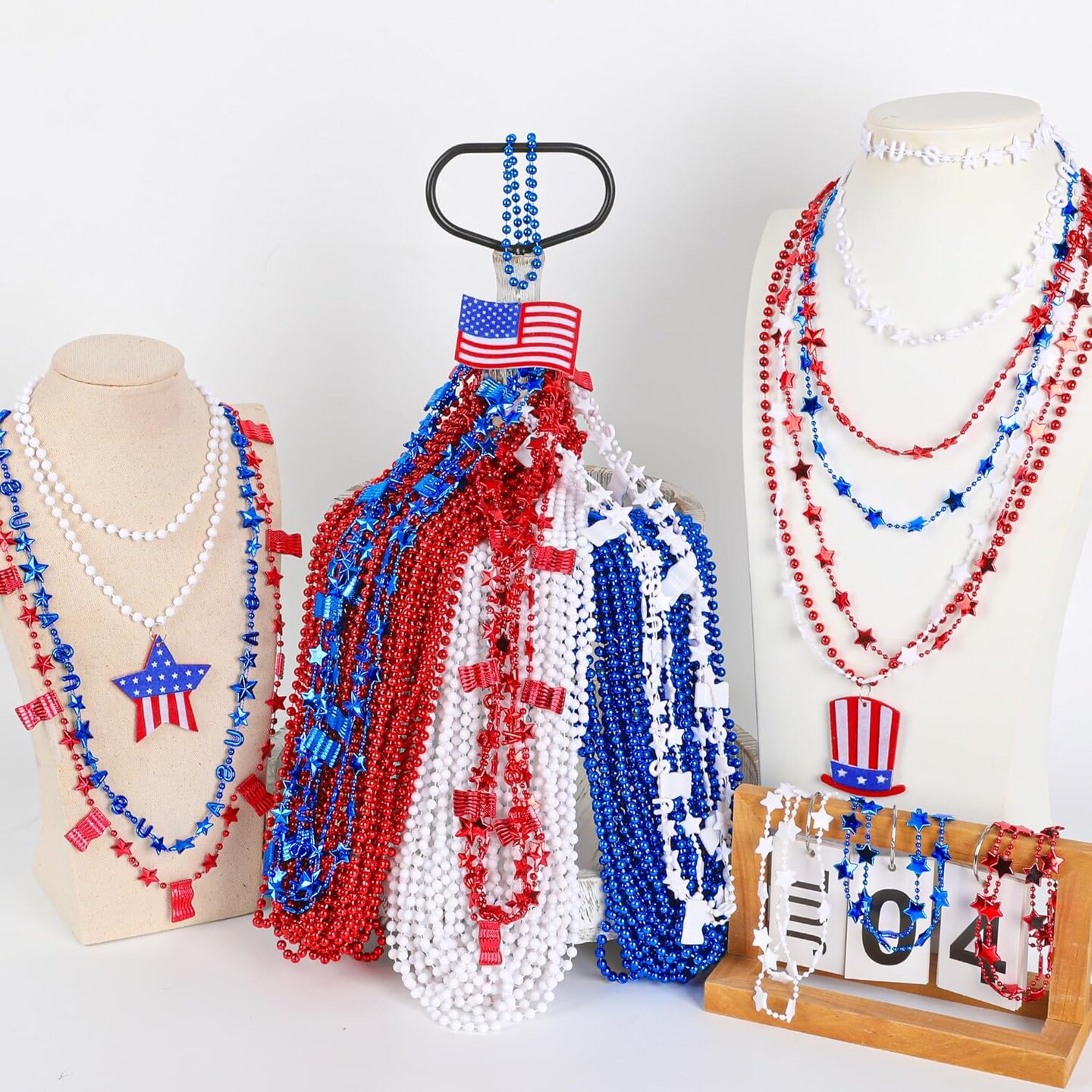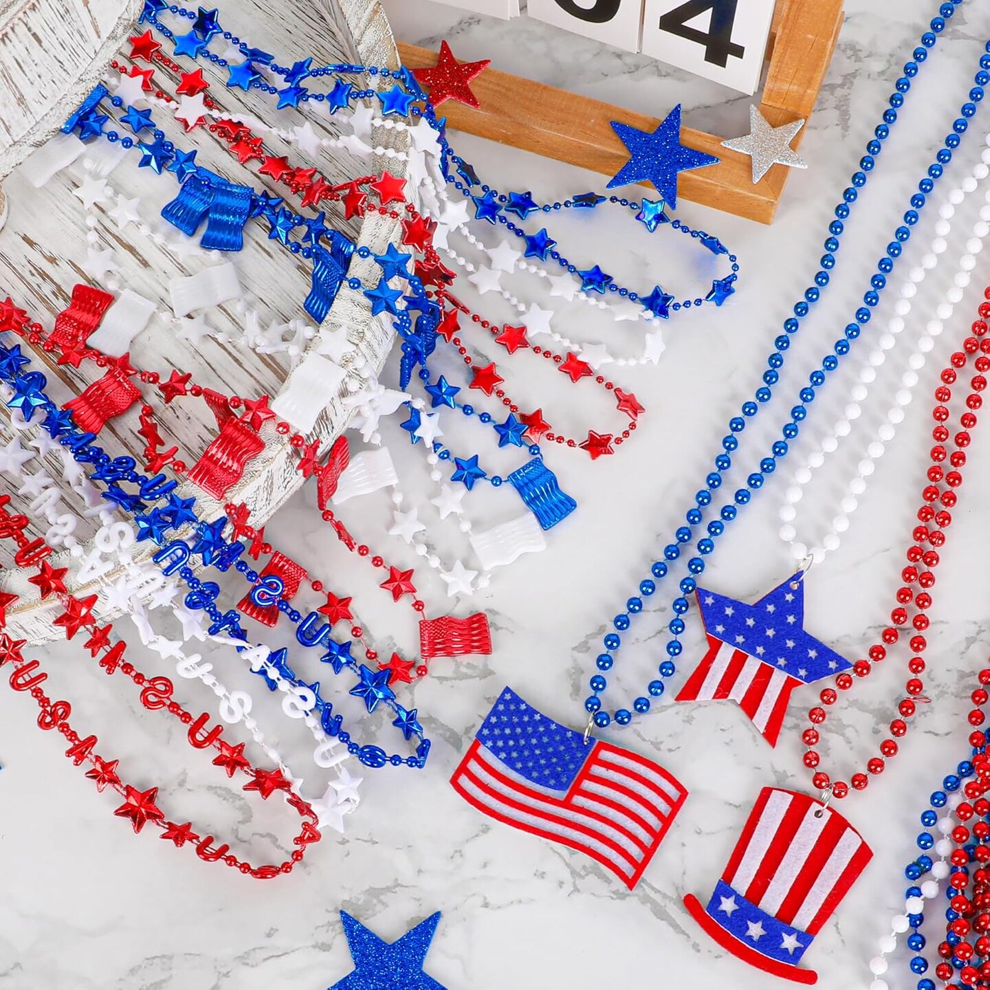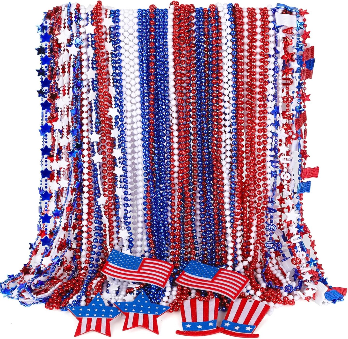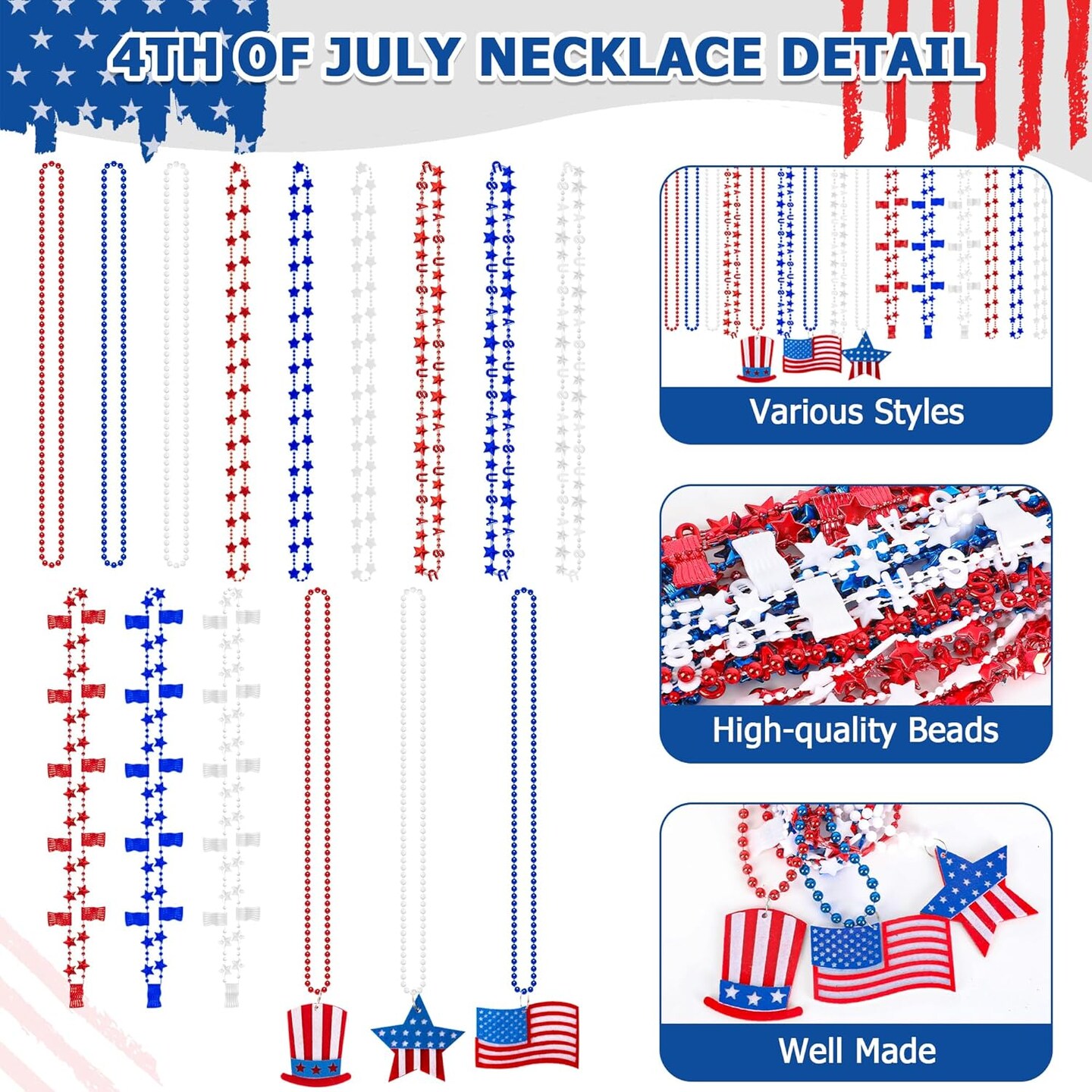 72PCS 4th of July Accessories, Independence Day Bead Necklaces, USA Hat Flags Pendant Patriotic Fourth of July Red Blue White Necklace, Metallic Necklace for Flag Day Parades Party Favors Decorations