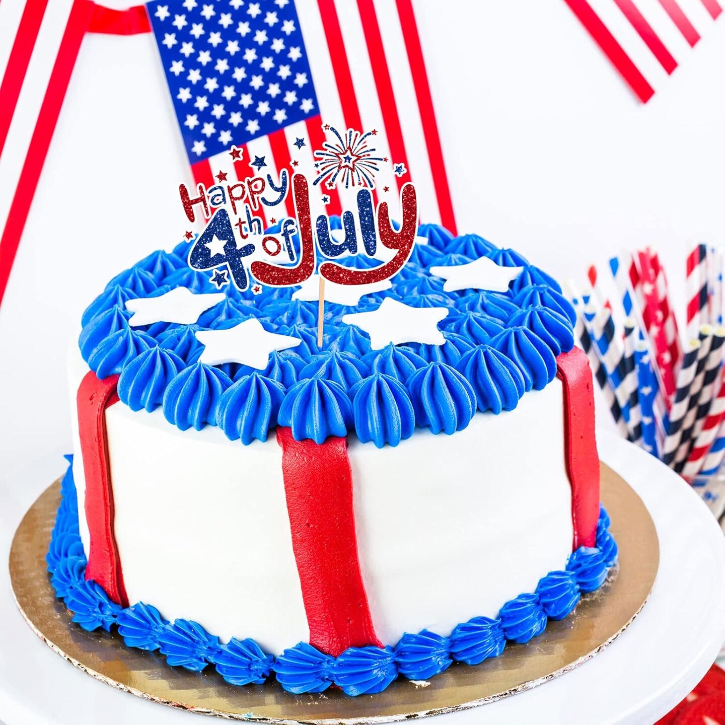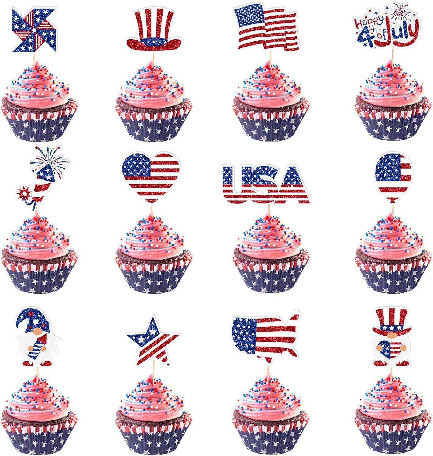 72-Piece Patriotic Cupcake Toppers, 4th of July Glitter Cupcake Picks with 12 Cartoon Red, White, & Blue Designs, Food Picks with Sticks and Glue Points for Independence Day, Memorial Day, and Party Cake Decorations