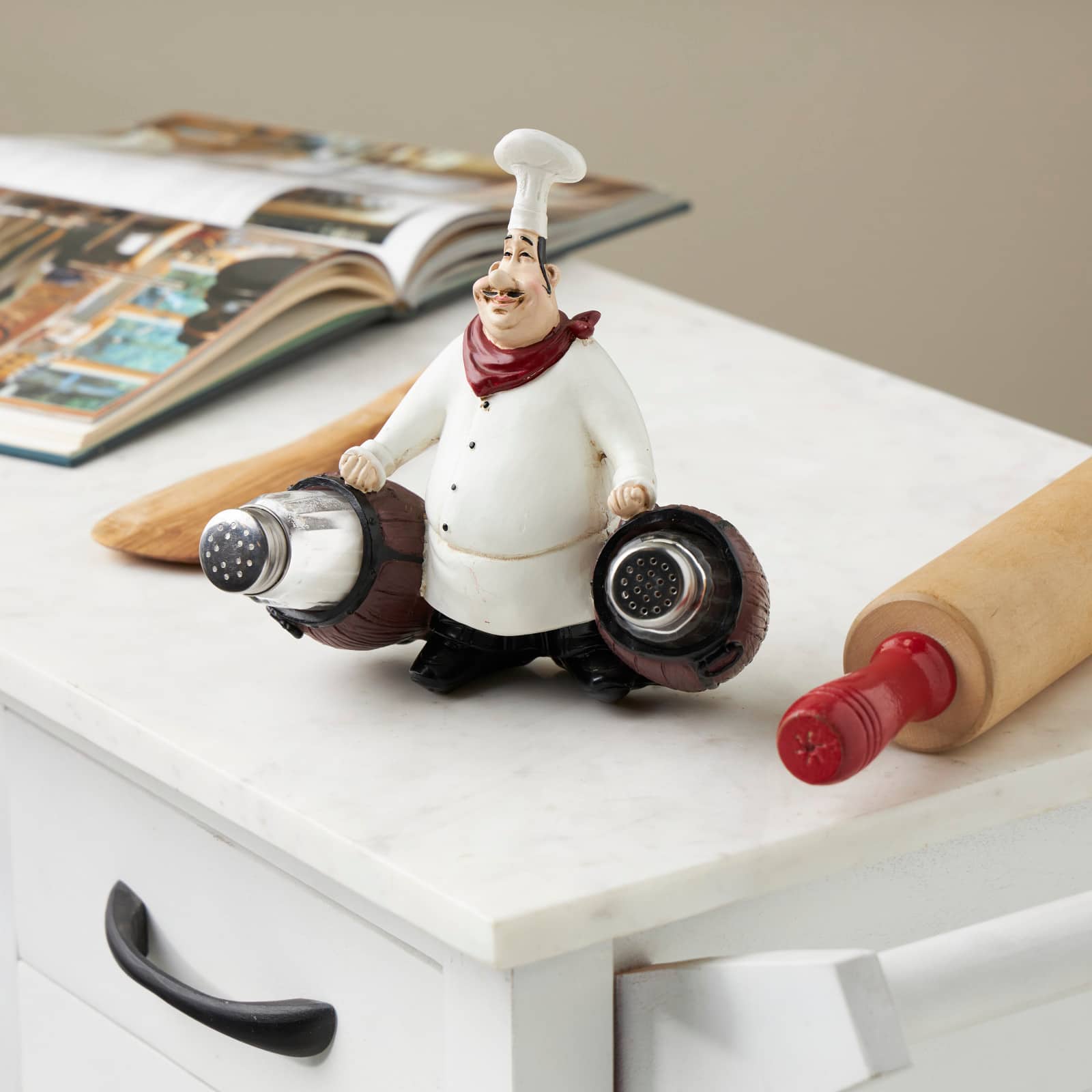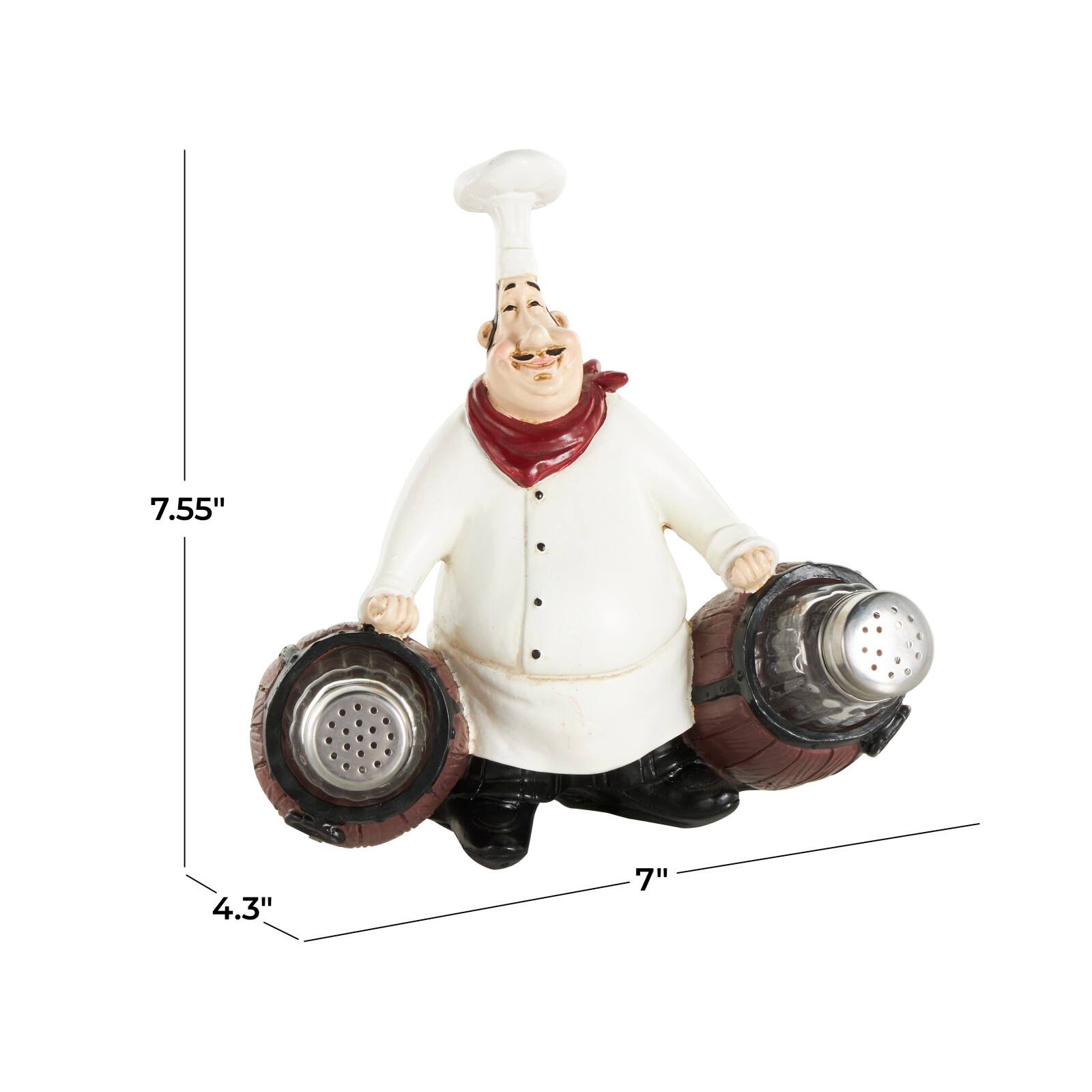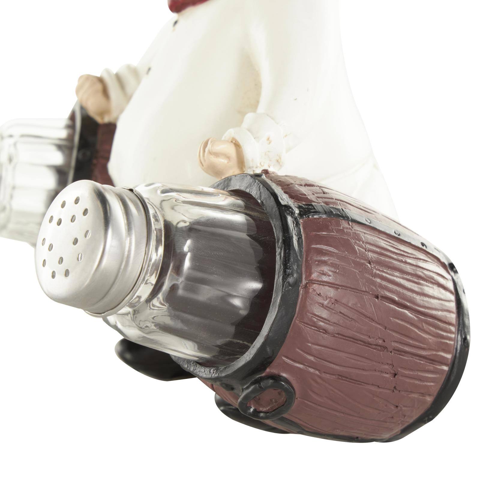 7.5" White Polystone Chef Figurine Salt & Pepper Shaker Holder with Wood Barrel Accents