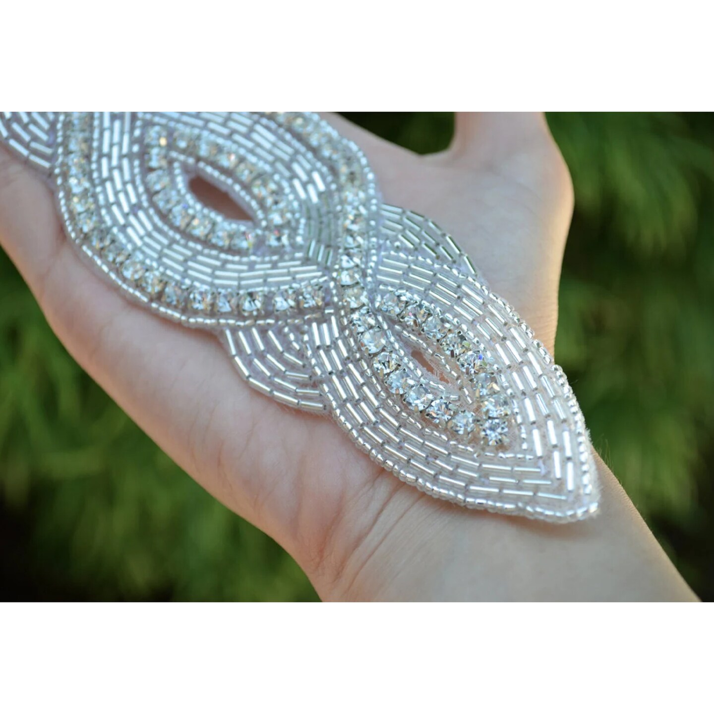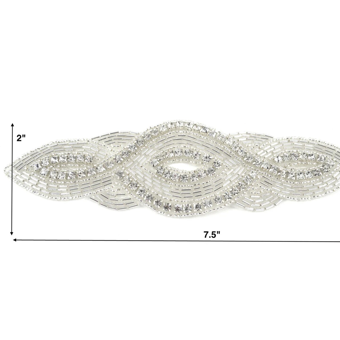 7.5" x 2" Silver Rhinestone Beaded Applique Patch for Wedding Gown Headpiece DIY