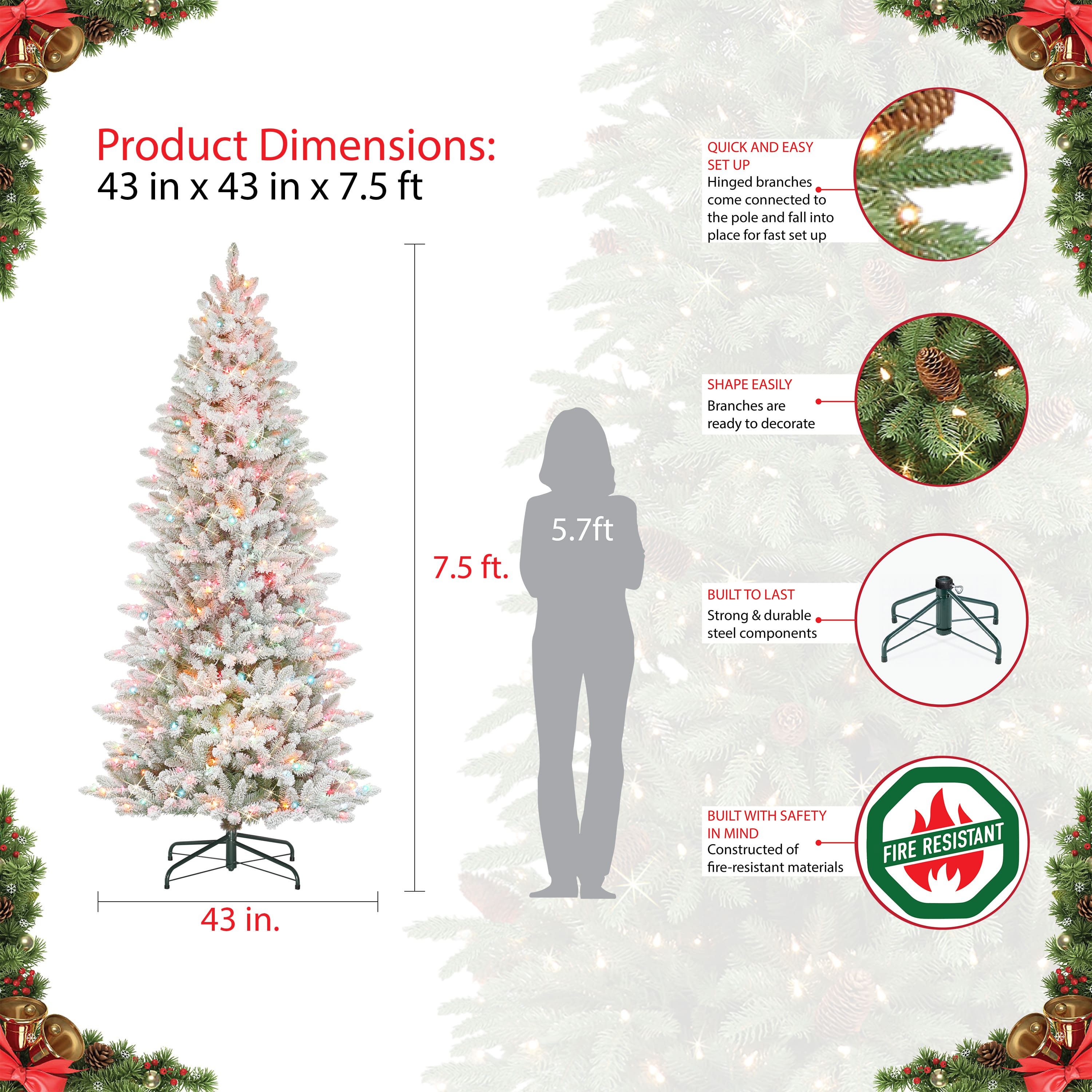 7.5ft Pre-Lit White Slim Fraser Fir Flocked Artificial Christmas Tree, Multicolor Lights