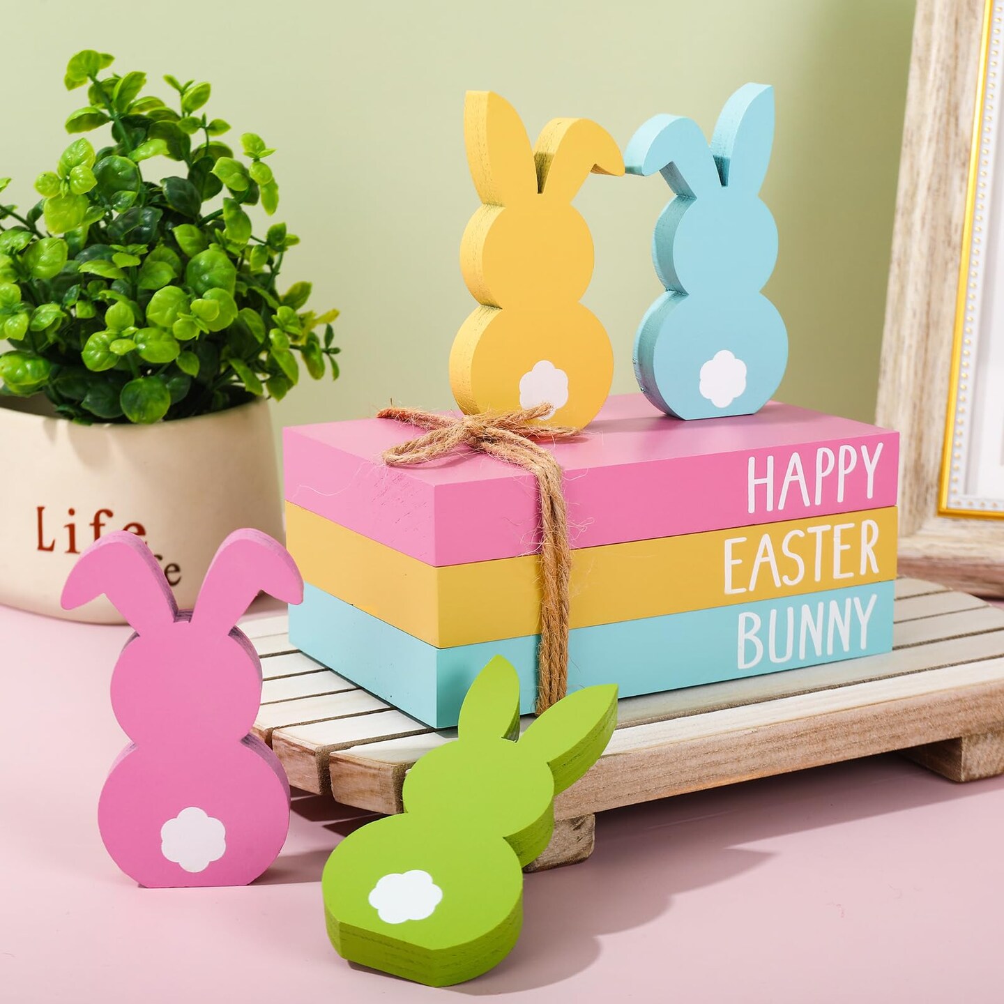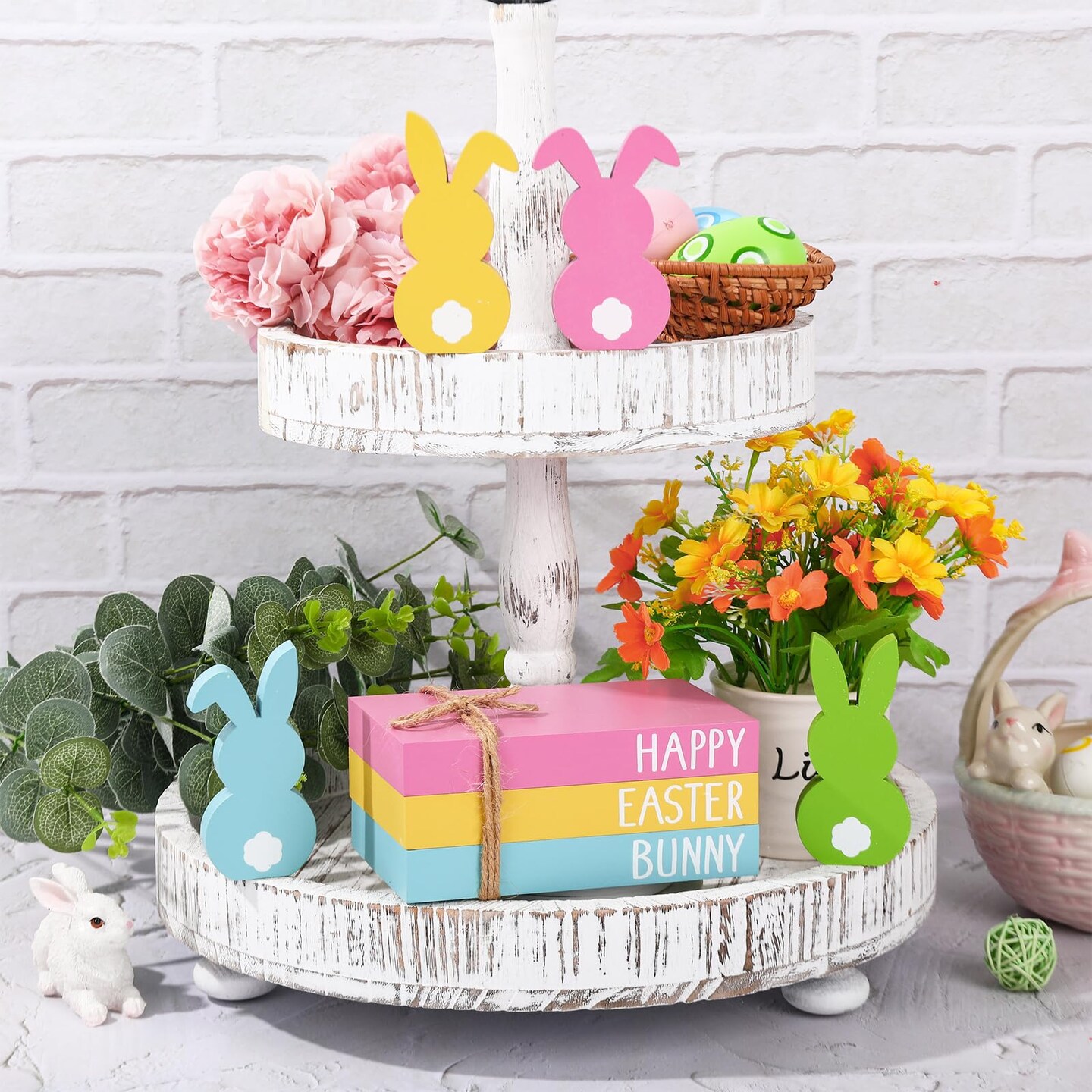 7Pcs Easter Wooden Tiered Tray Decor Pastel Happy Easter Bunny Faux Stacked Books Rabbit Table Centerpiece Block Signs for Spring Party Farmhouse Home Kitchen