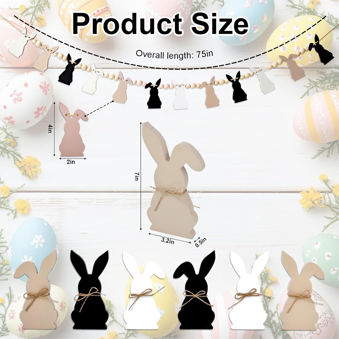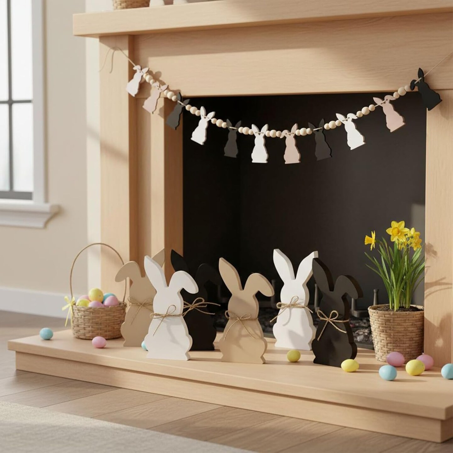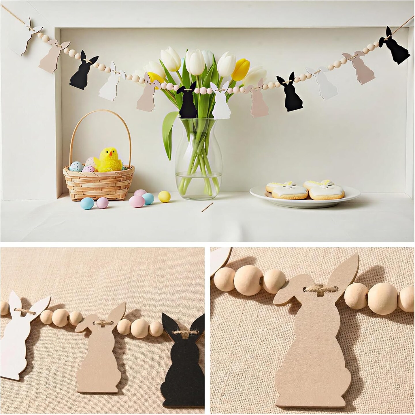 7-Piece Easter Bunny Garland – Wooden Beaded Mantel Banner with 6 Rabbits for Spring & Easter Home Decor