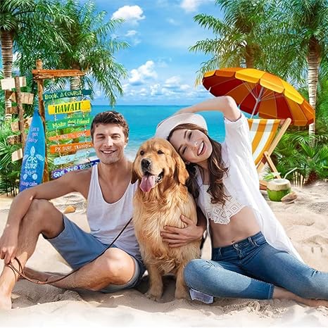 7x5FT Summer Hawaiian Beach Backdrop, Blue Sky Ocean Backdrops, Palm Tree Surfboard Street Sign and Beach Chair Photography Background, Hawaiian Luau Aloha Party Decorations Banner