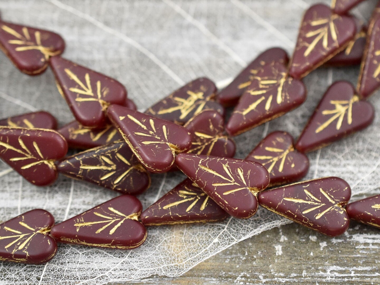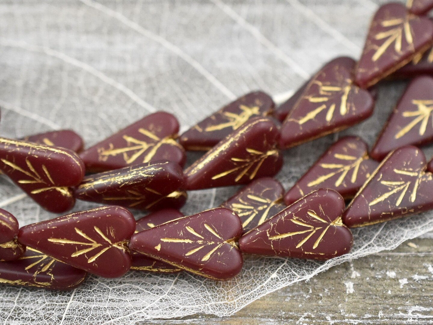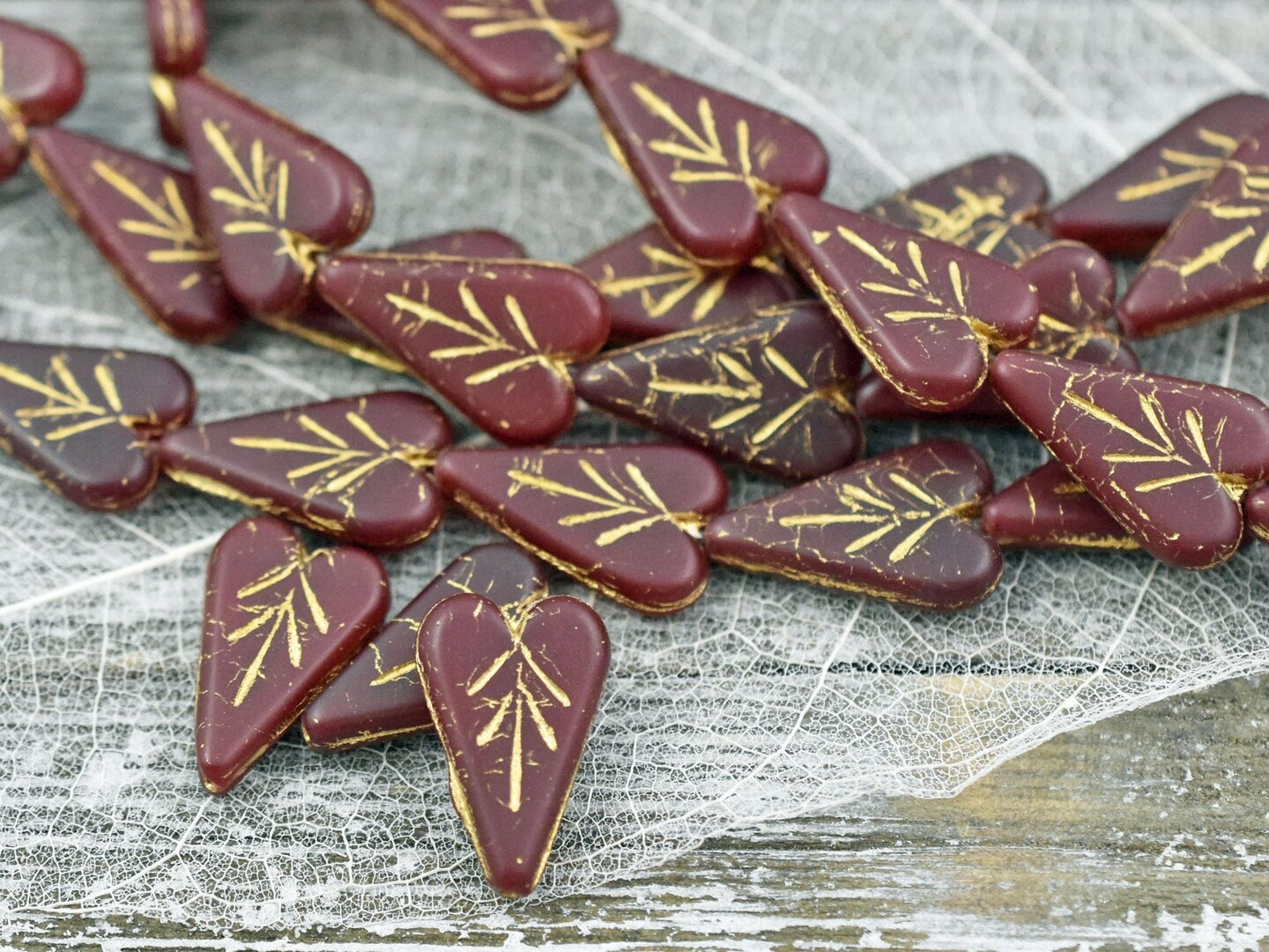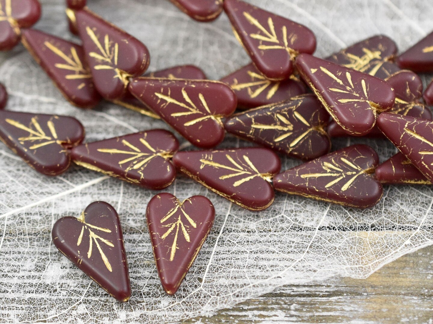 *8* 17x11mm Gold Washed Matte Ruby Red Heart Leaf Beads