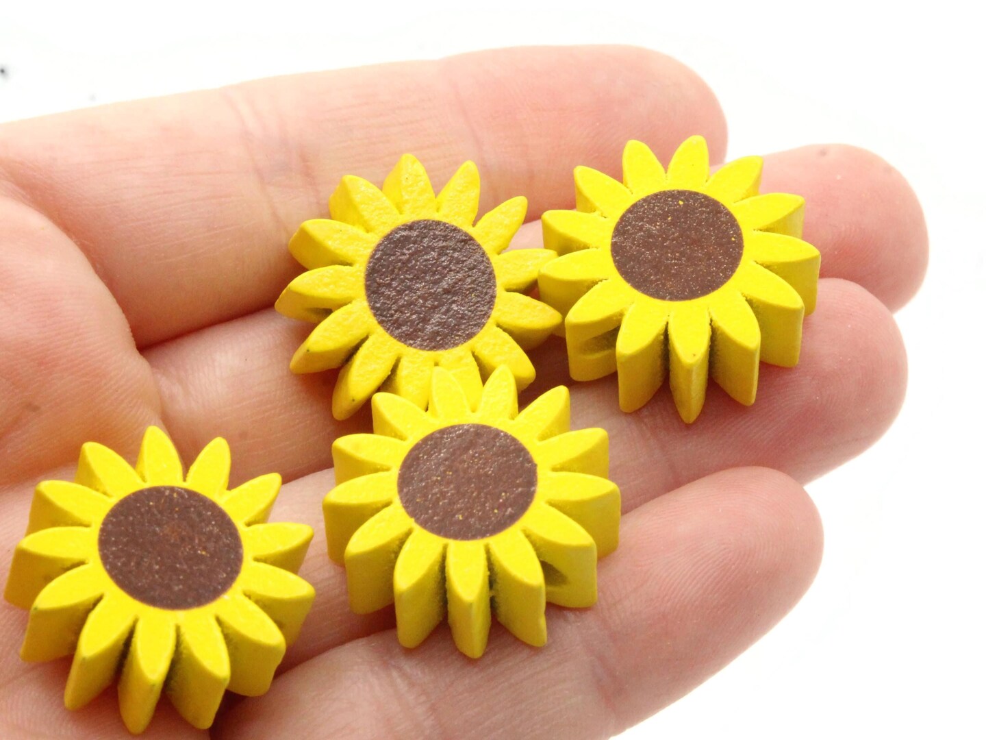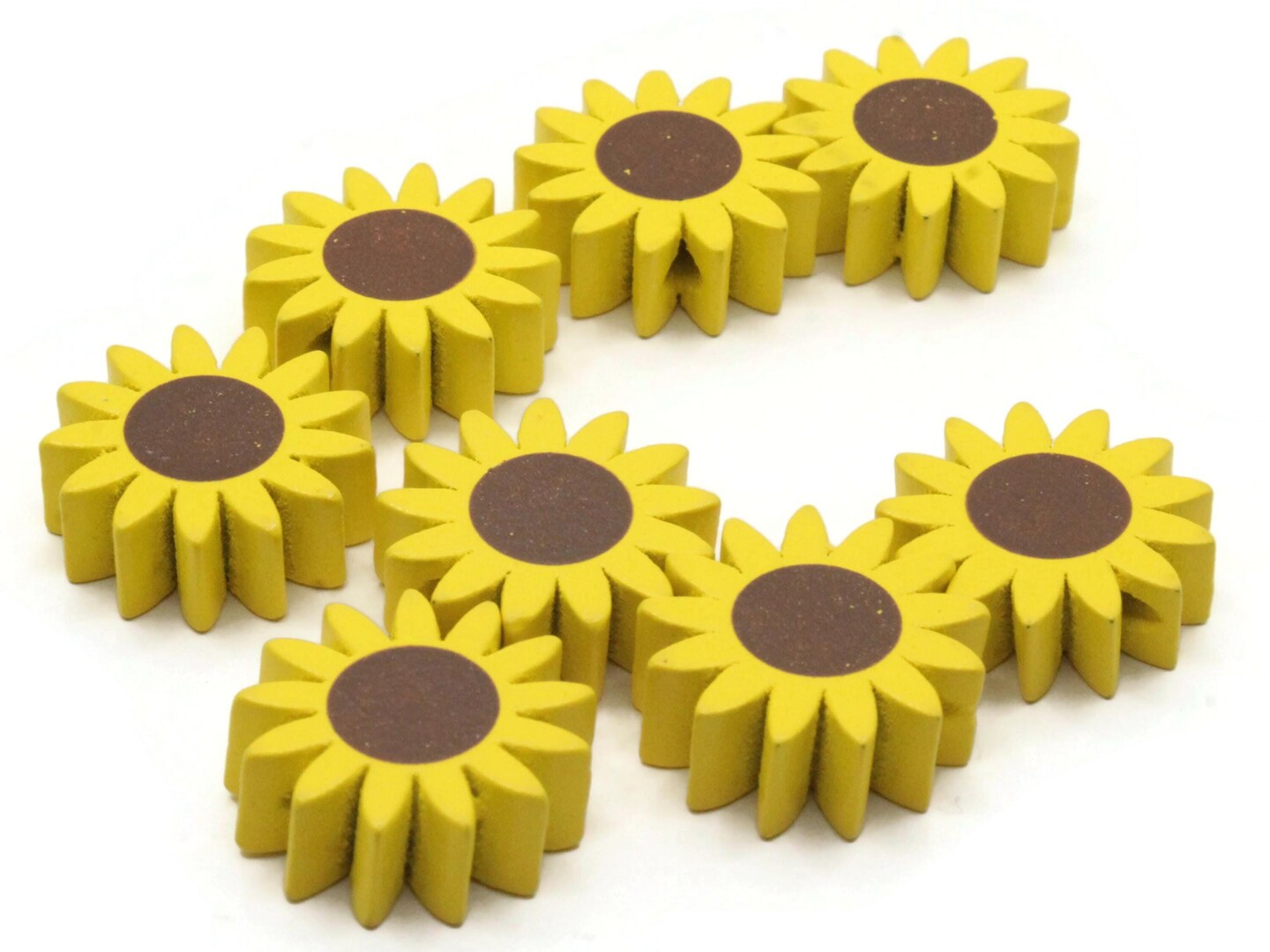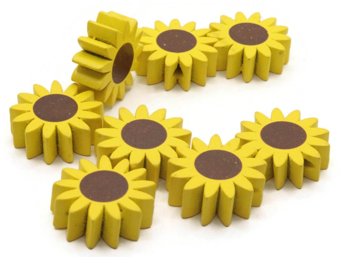 8 21mm Sunflower Beads Yellow Flower with Brown Center Flat Floral Wood Beads