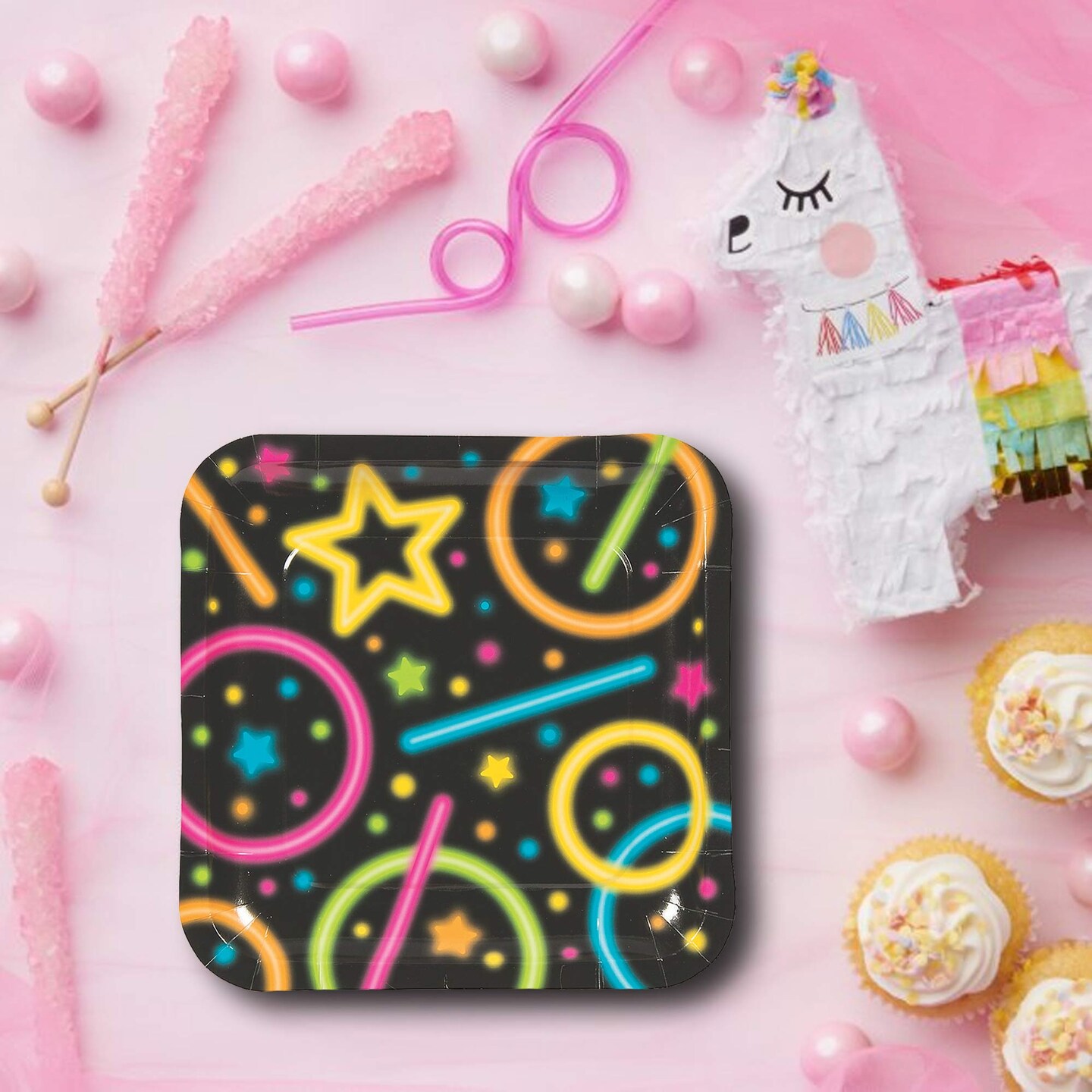 8 Count Neon Glow Rings and Stars Square Paper Plates 9 Inch for Birthday Parties