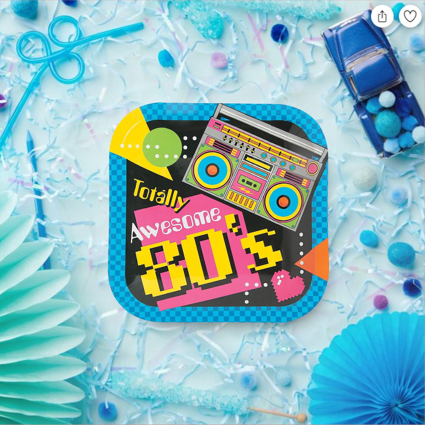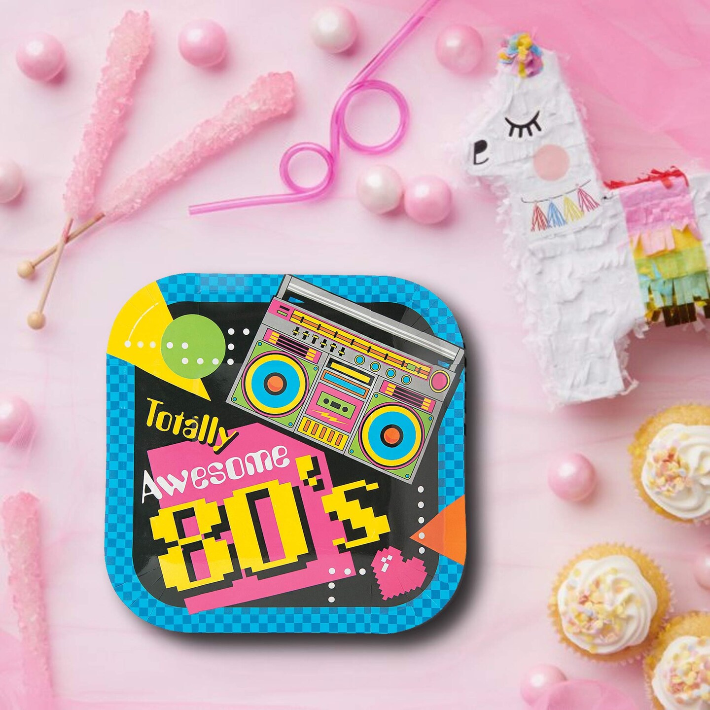 8 Ct. 80's Party Square Dessert Plates Neon Boombox Design 7" Paper Plates