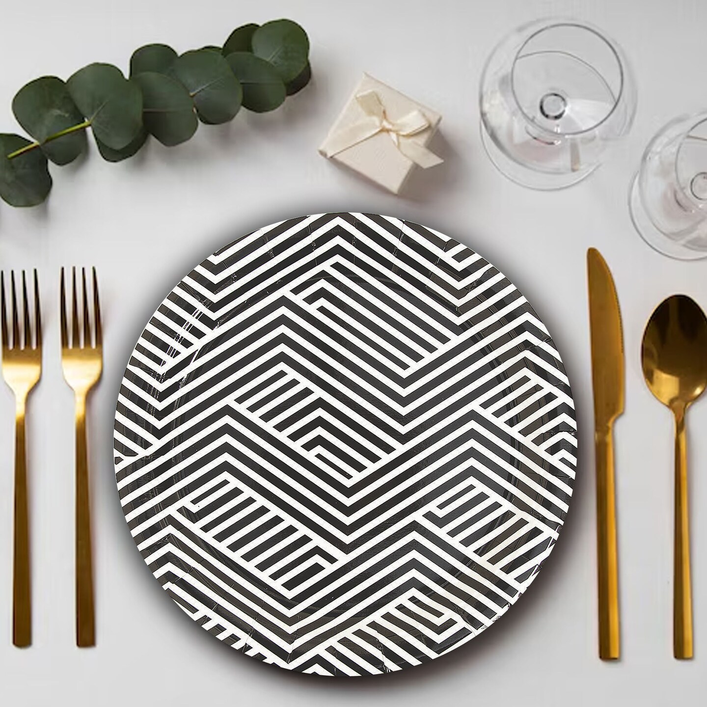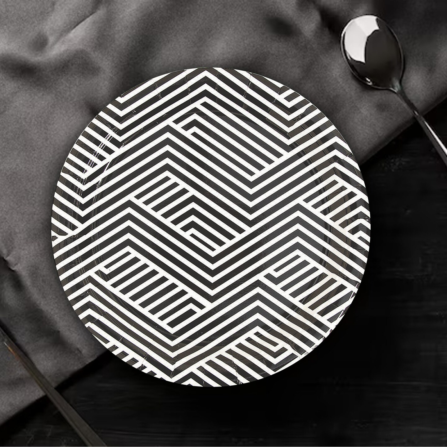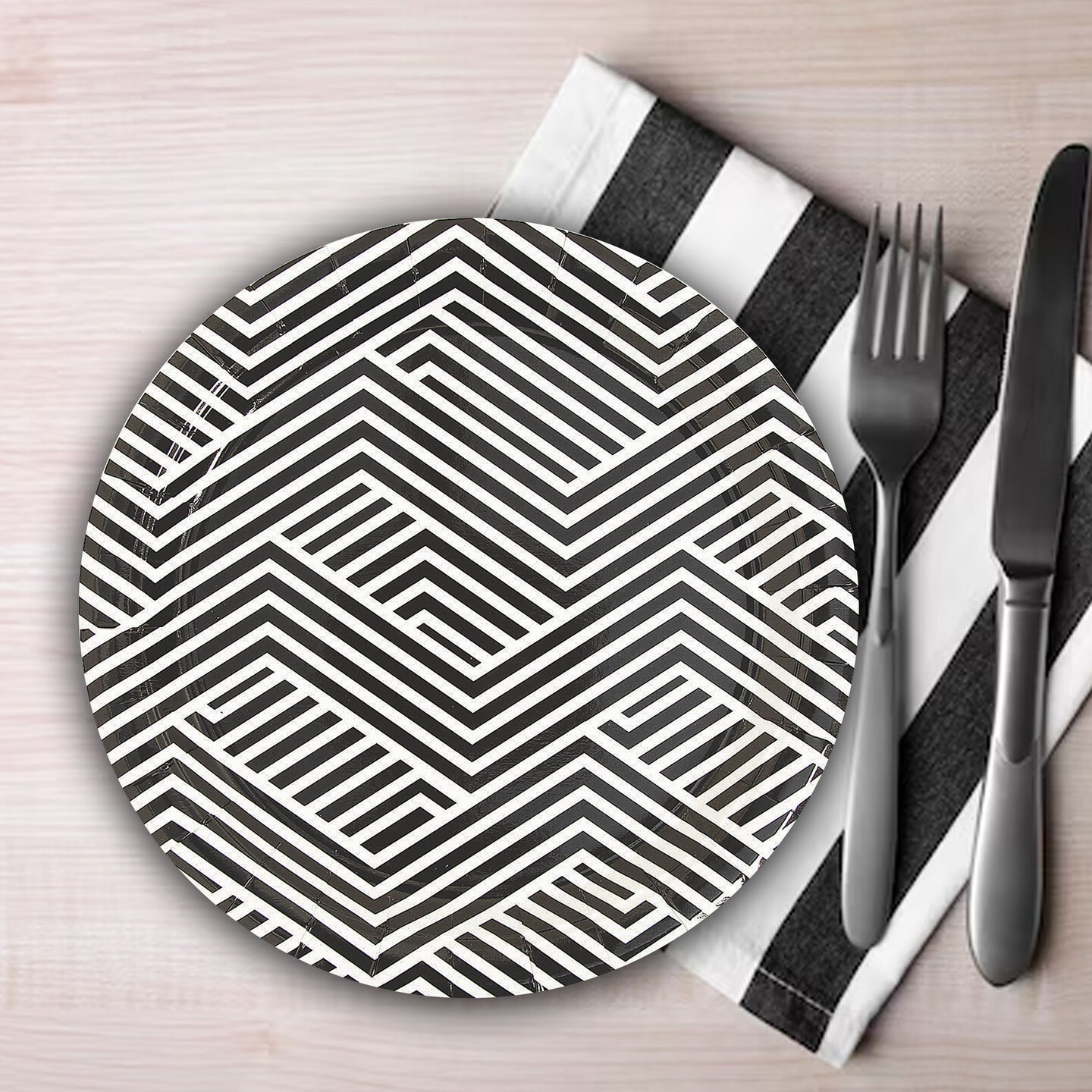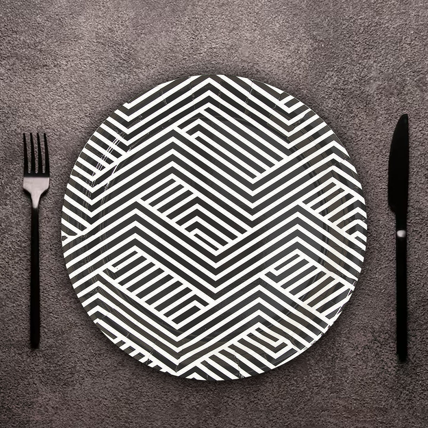 8 Ct. Black Overlapping Chevrons Round Paper Dinner Plates 9" Disposable Party Plates