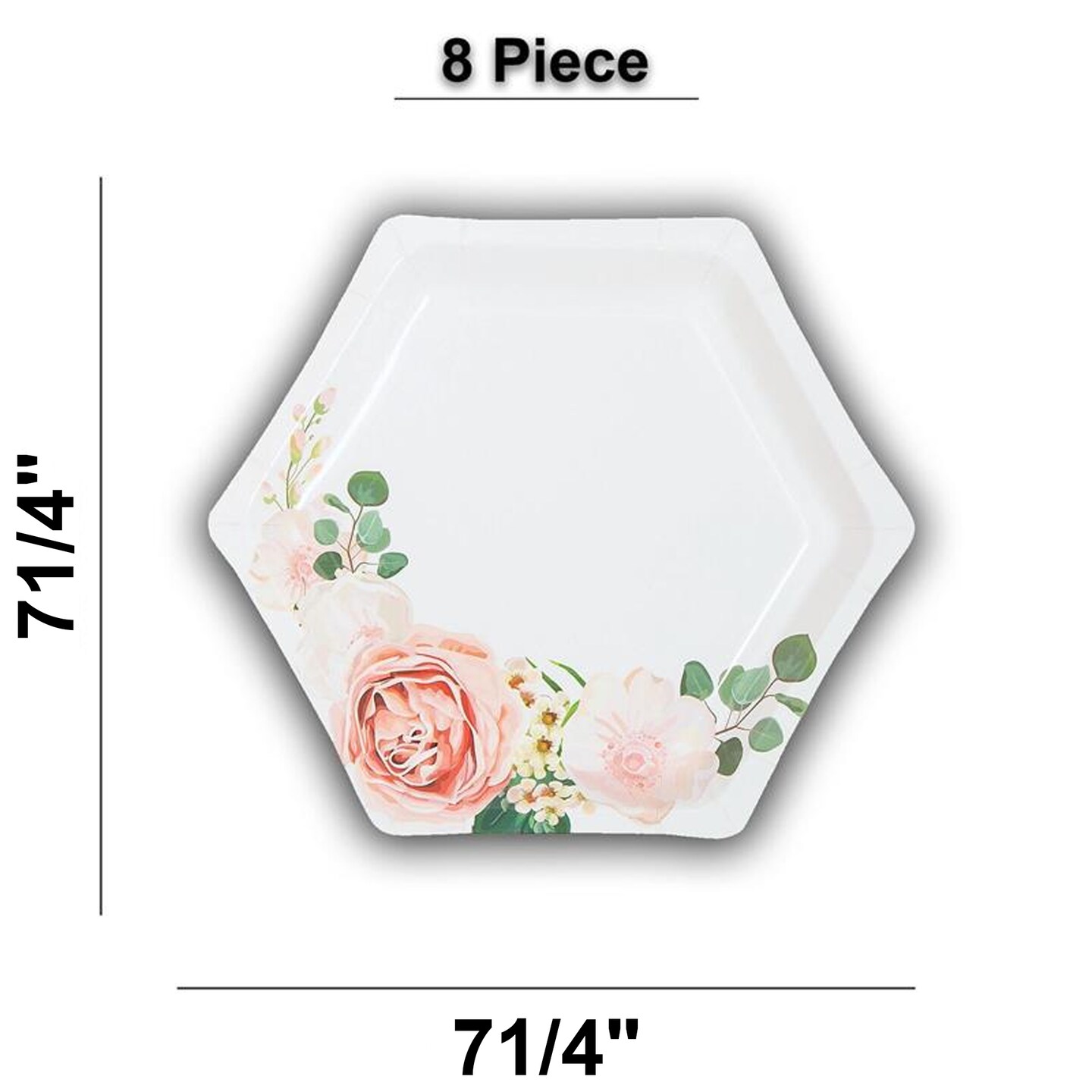 8 Ct. Blush Floral Hexagonal Paper Dessert Plates 7.25" Disposable Elegant Bridal Shower Plates