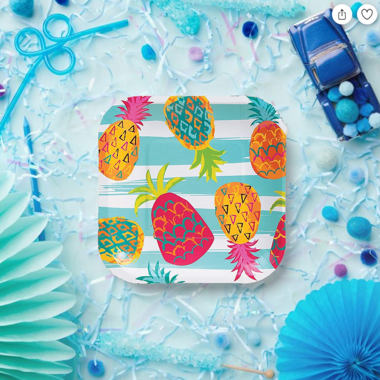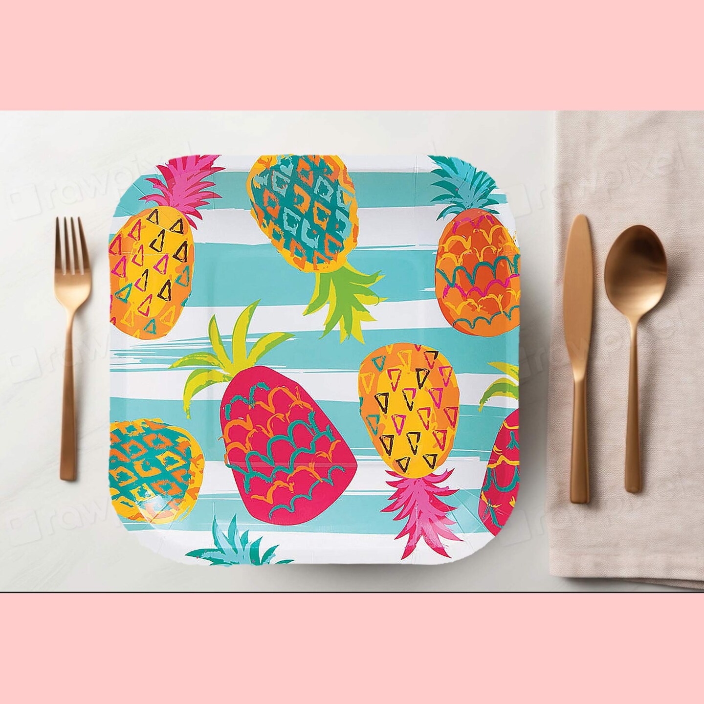 8 Ct. Pineapple Dessert Plates 7" Square Paper Plates with Tropical Stripe Design