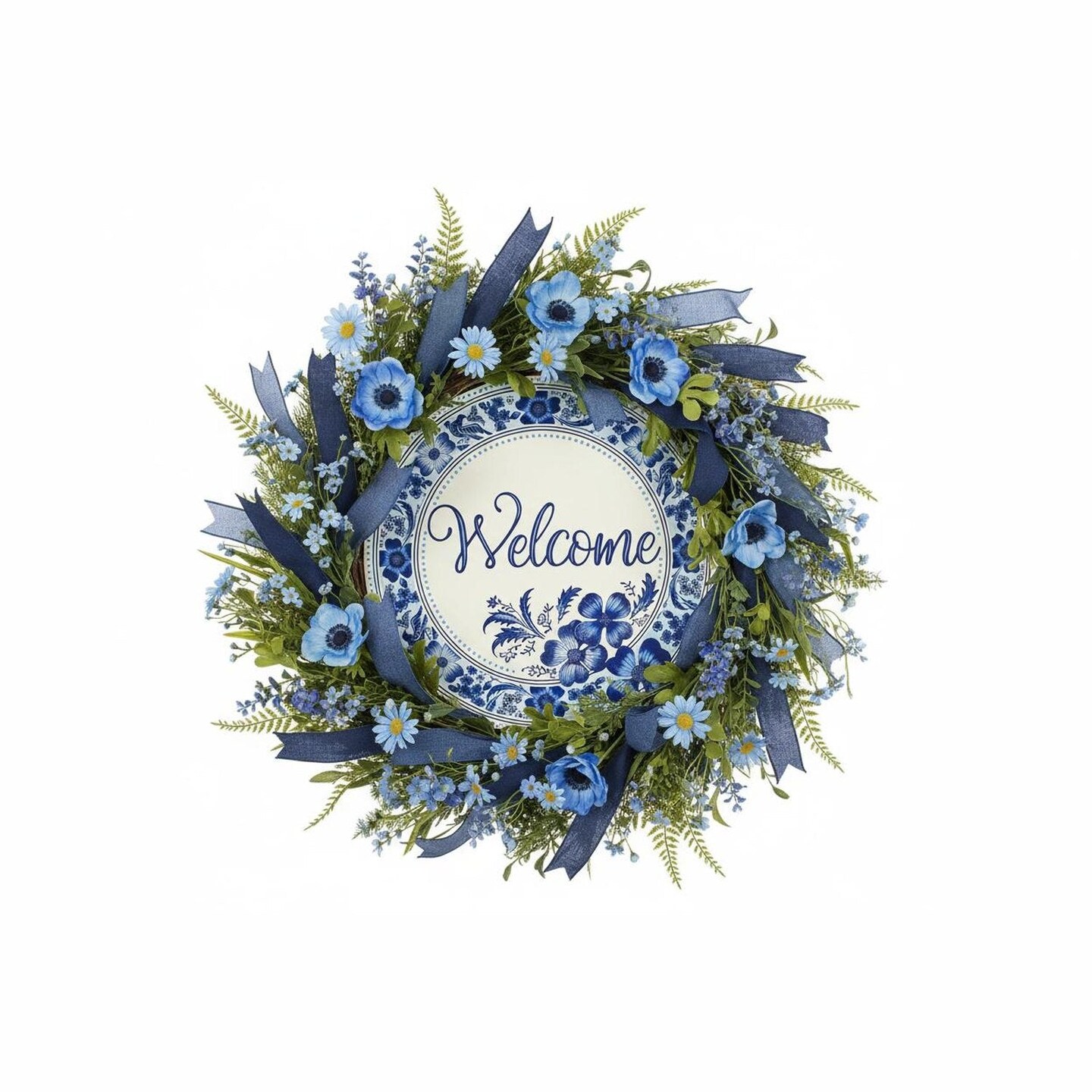 8" Metal Round Sign: Welcome Blue Floral