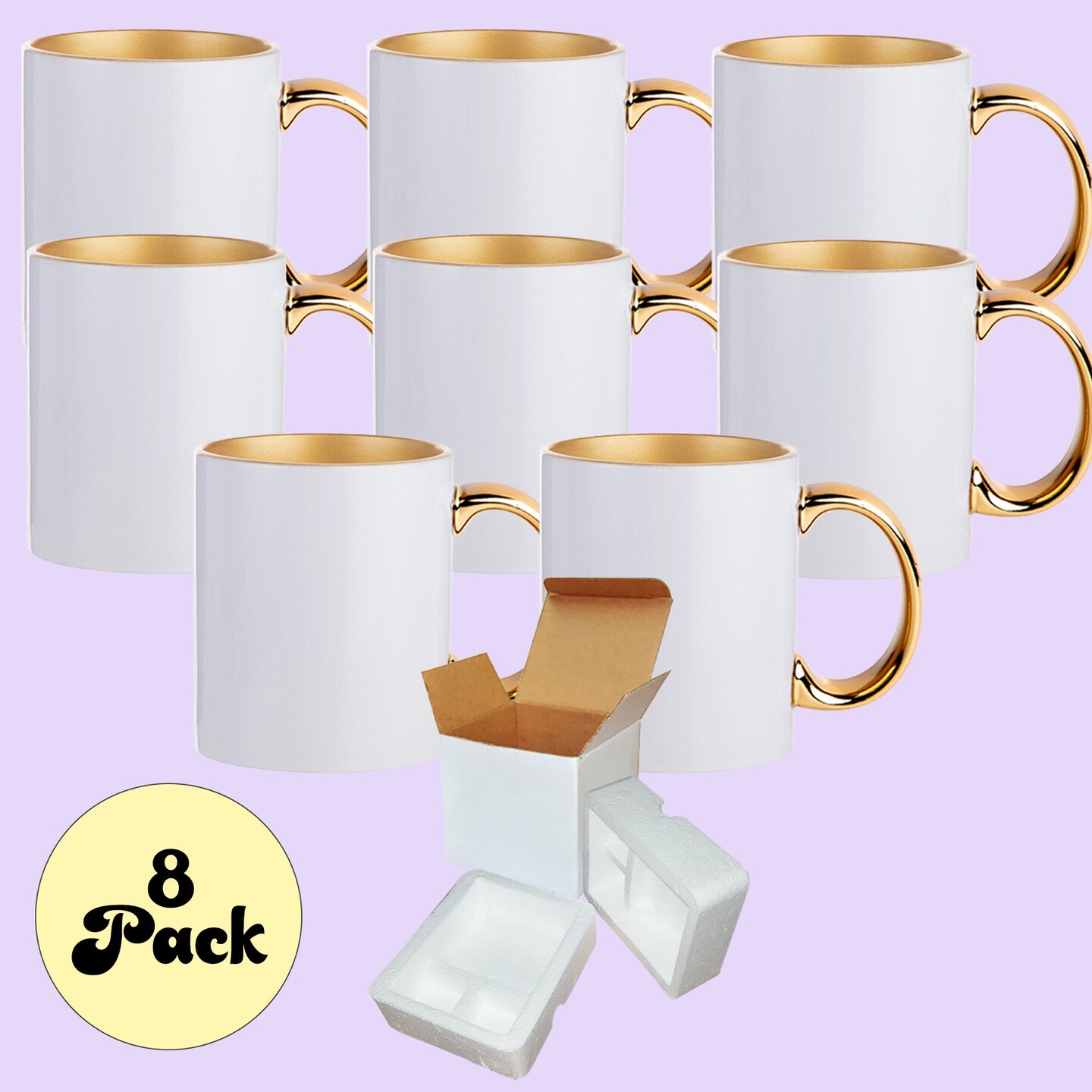 8 Pack 11 oz. GOLD Inner and Handle - Ceramic Sublimation Mugs - Professional Grade - Cardboard Box with Foam Supports