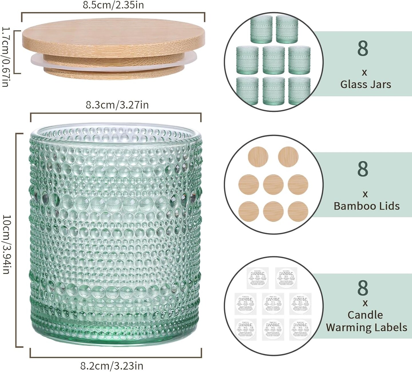 8 Pack 14 OZ Empty Glass Candle Making Jars with Bamboo Lids and Labels (Green) 3.3 x 3.3 x 3.9 inches