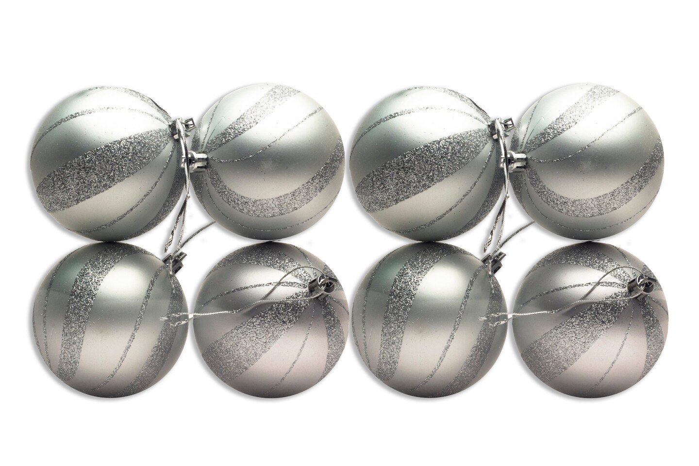 8 Pack of Matte Silver Ball Ornaments with Silver Glitter Swirl Designs