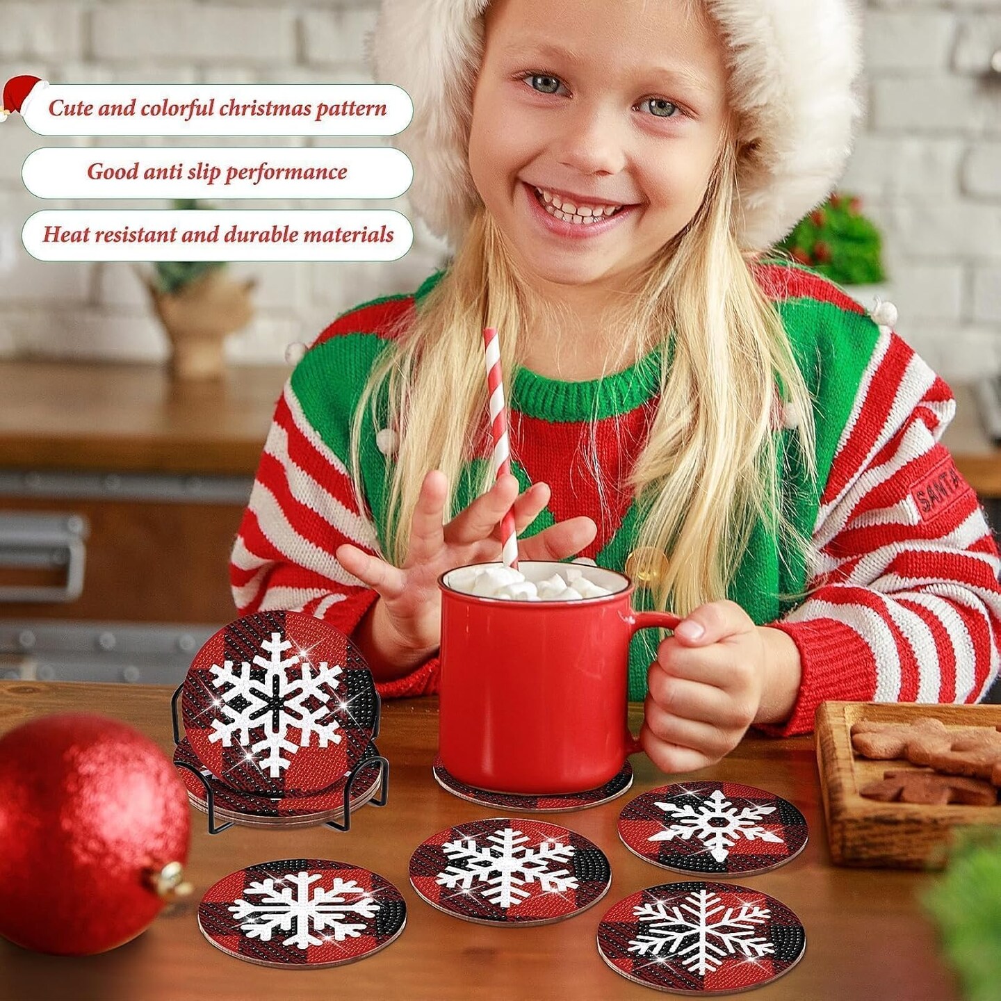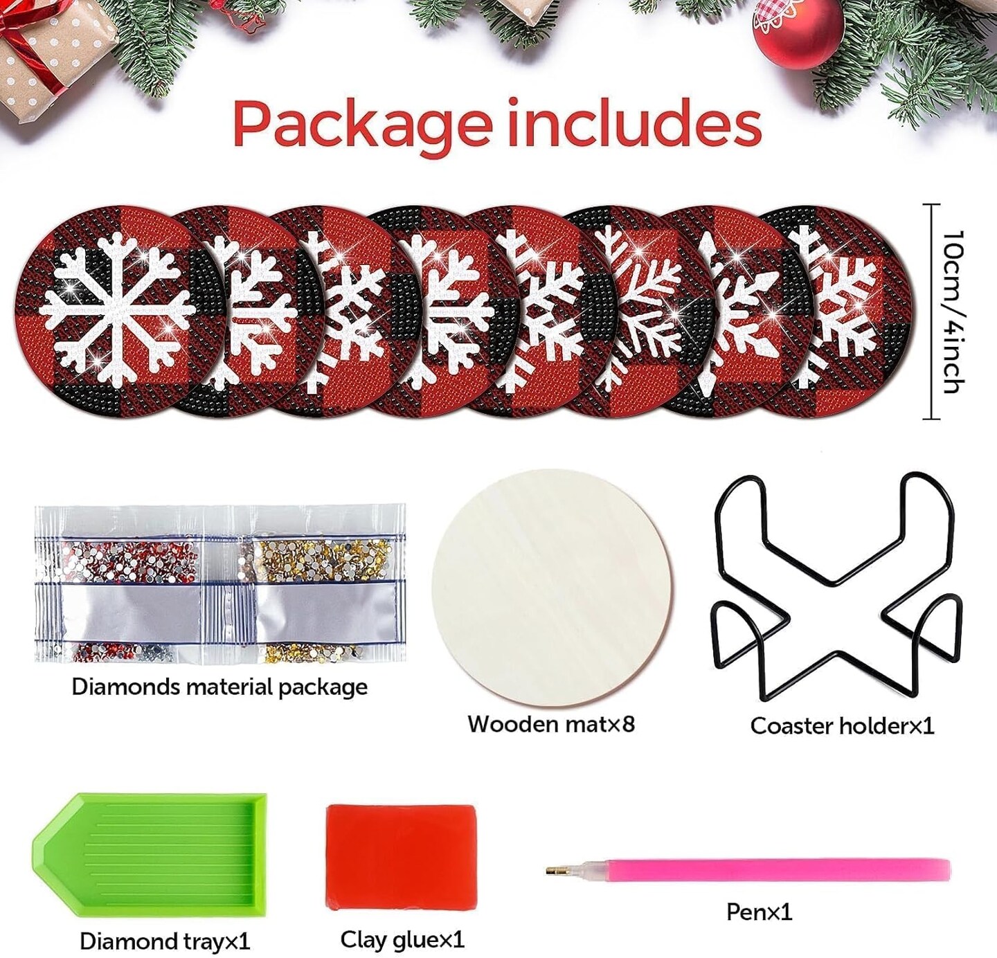 8 Pcs Christmas Snowflake Diamond Art Coasters Kit with Holder Red and Black Plaid Snowflake Diamond Art Coasters for Adults Diamond Art Kit Supplies for Xmas Holiday Presents