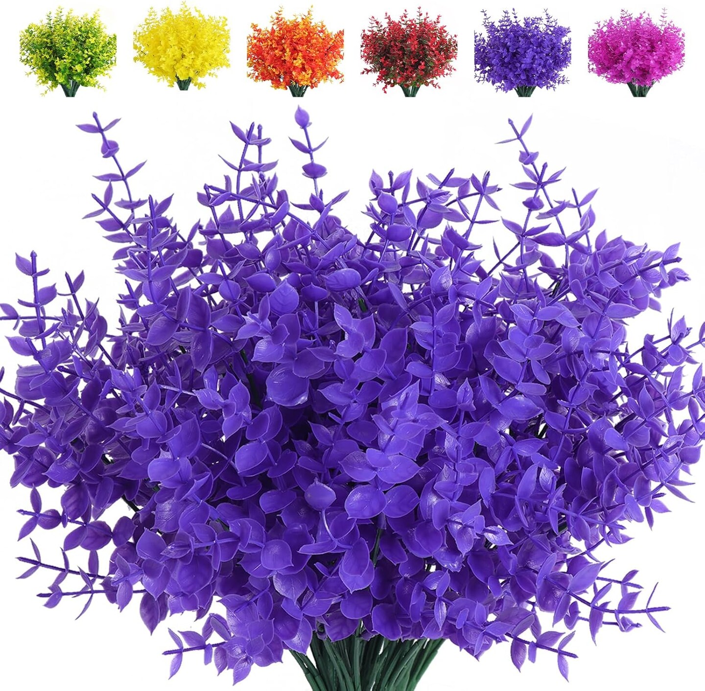 8 Pcs Outdoor Artificial Plants – Purple Ferns & Boxwood for Window Boxes & Garden Decor (Pure Purple Eucalyptus)