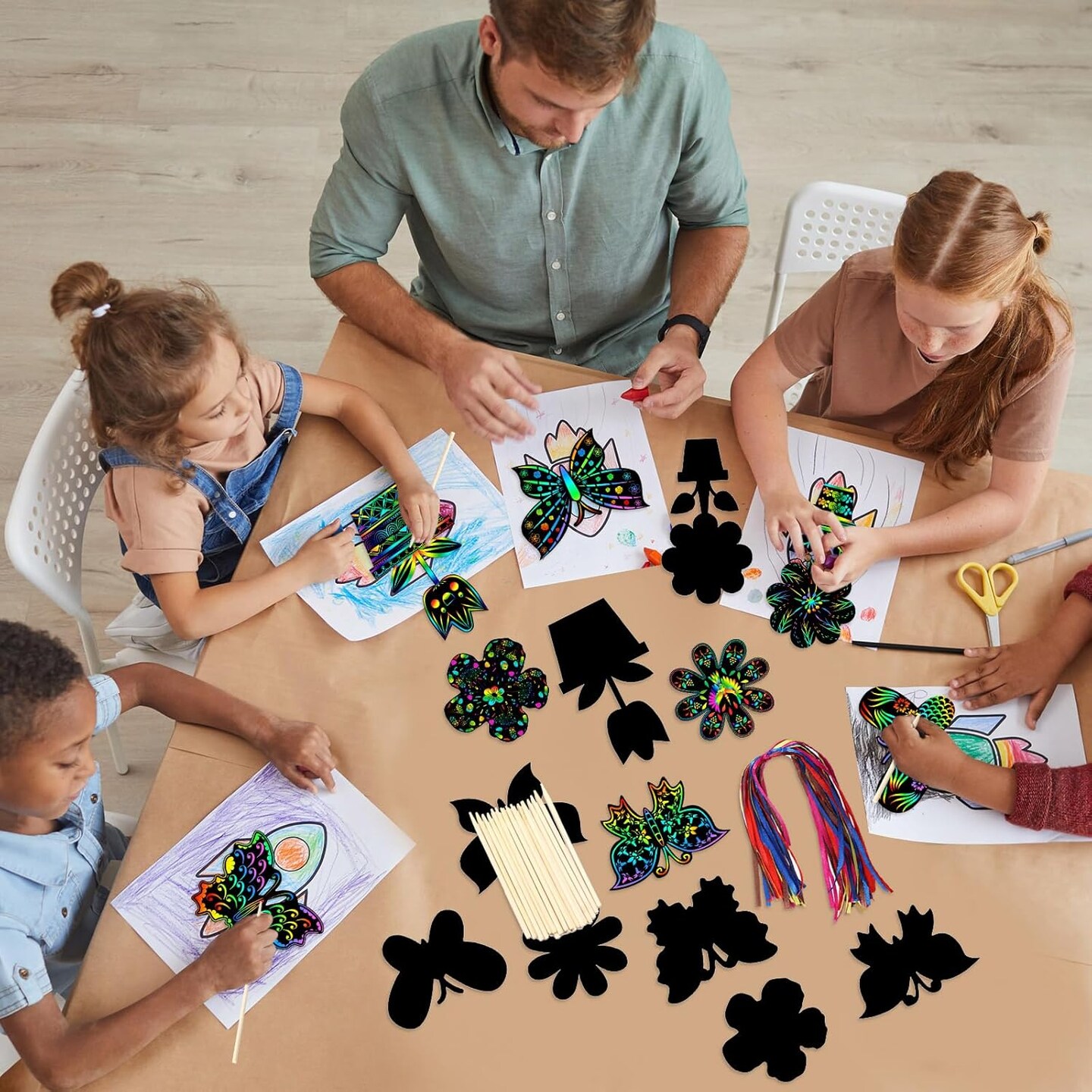 80 Pcs Spring Scratch Cards Rainbow Flower Butterfly Scratch Paper for Kids Rainbow Flower Crafts with Bamboo Stylus and Ribbon