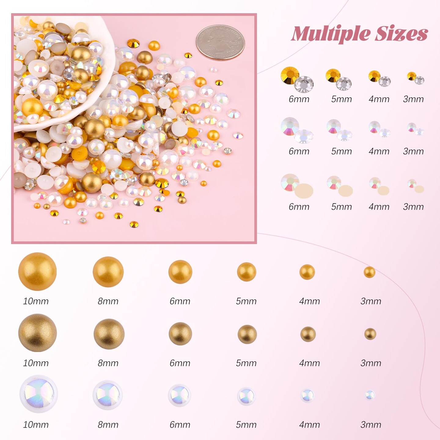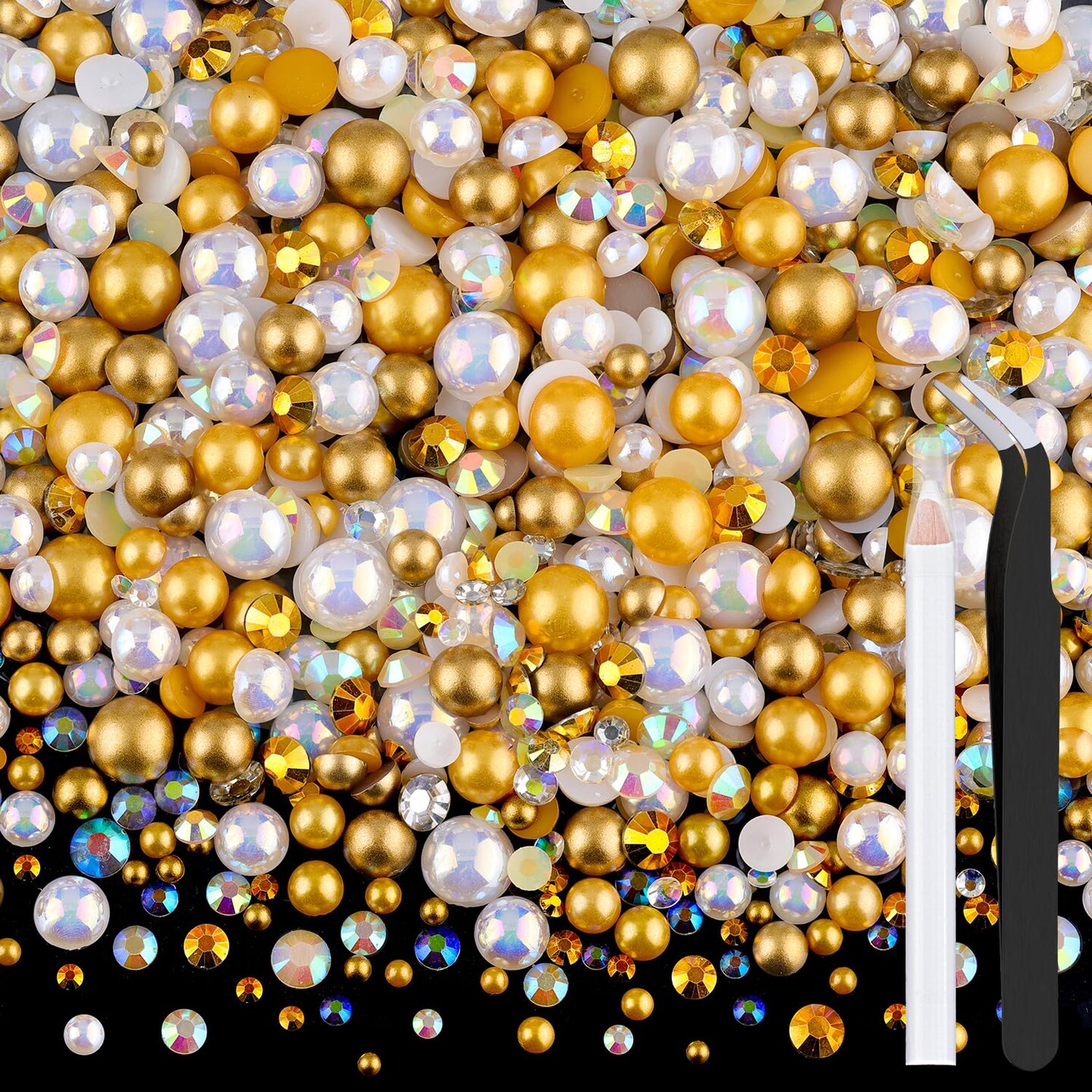 80g Flatback Pearls and Rhinestones for Crafting, White Brown Mixed Size 3-10mm Resin Rhinestones and Half Pearls for Bedazzling, Nail Art and Decoration with Tweezer and Pickup Pencil