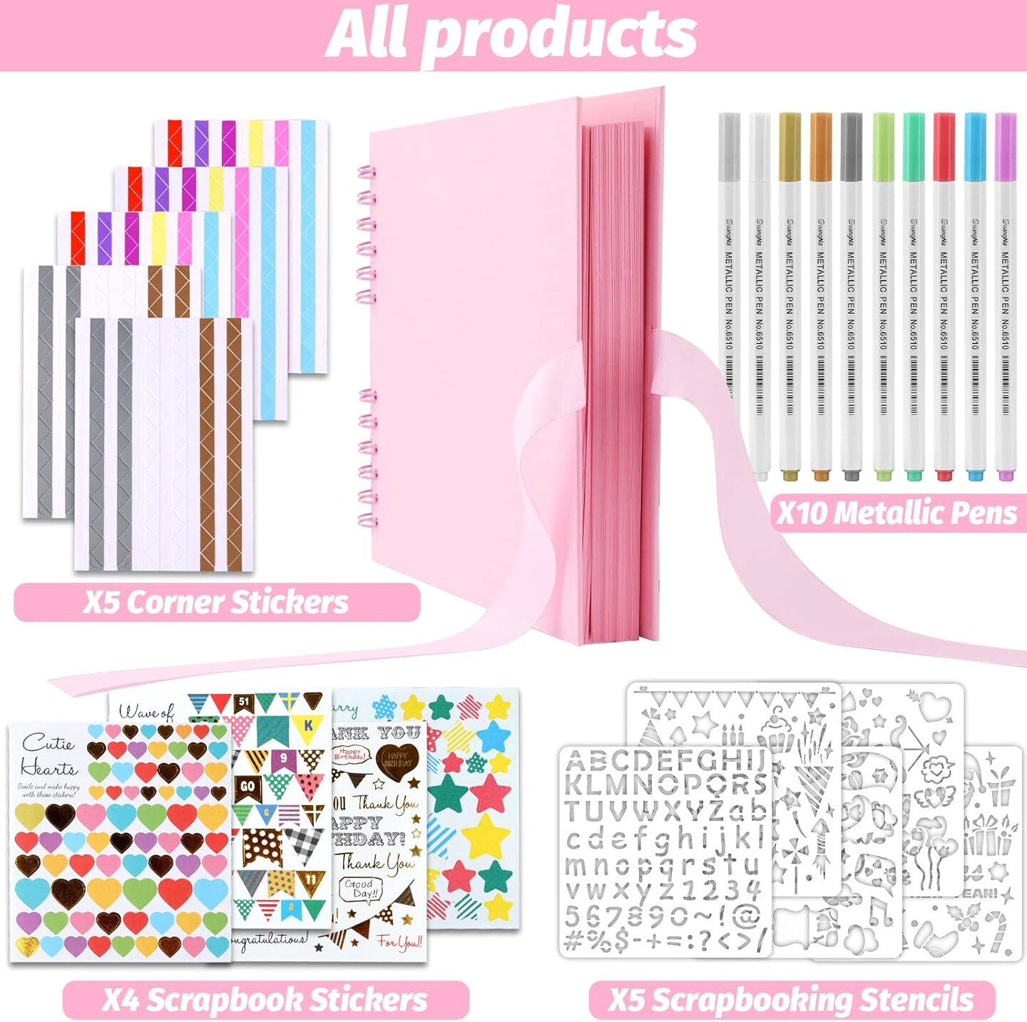 80-Page Scrapbook Album Kit with 10 Metallic Markers & Accessories - Pink (11.5*8.5 Inches)