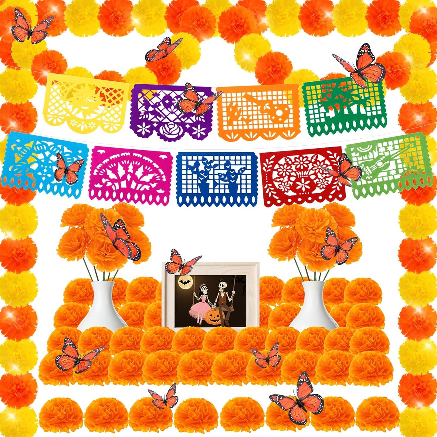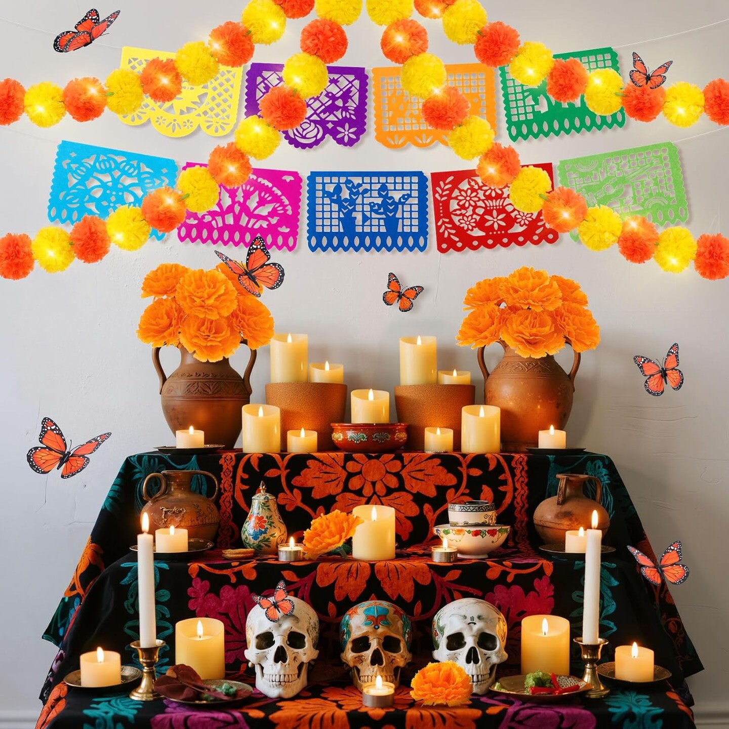85 Pcs Day of the Dead Decorations Set with Lights(Orange and Yellow)