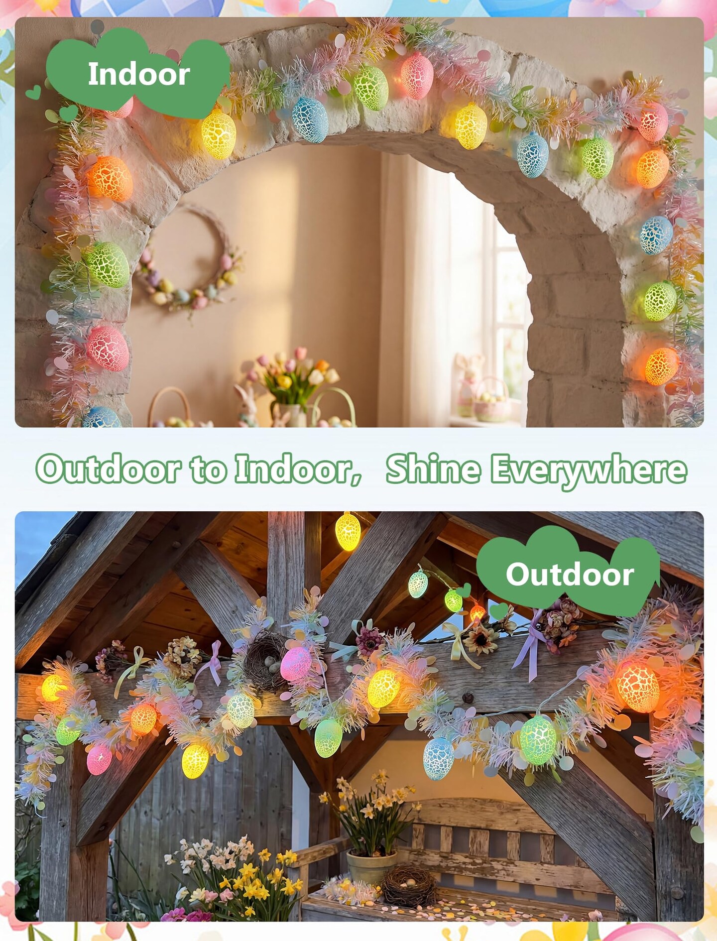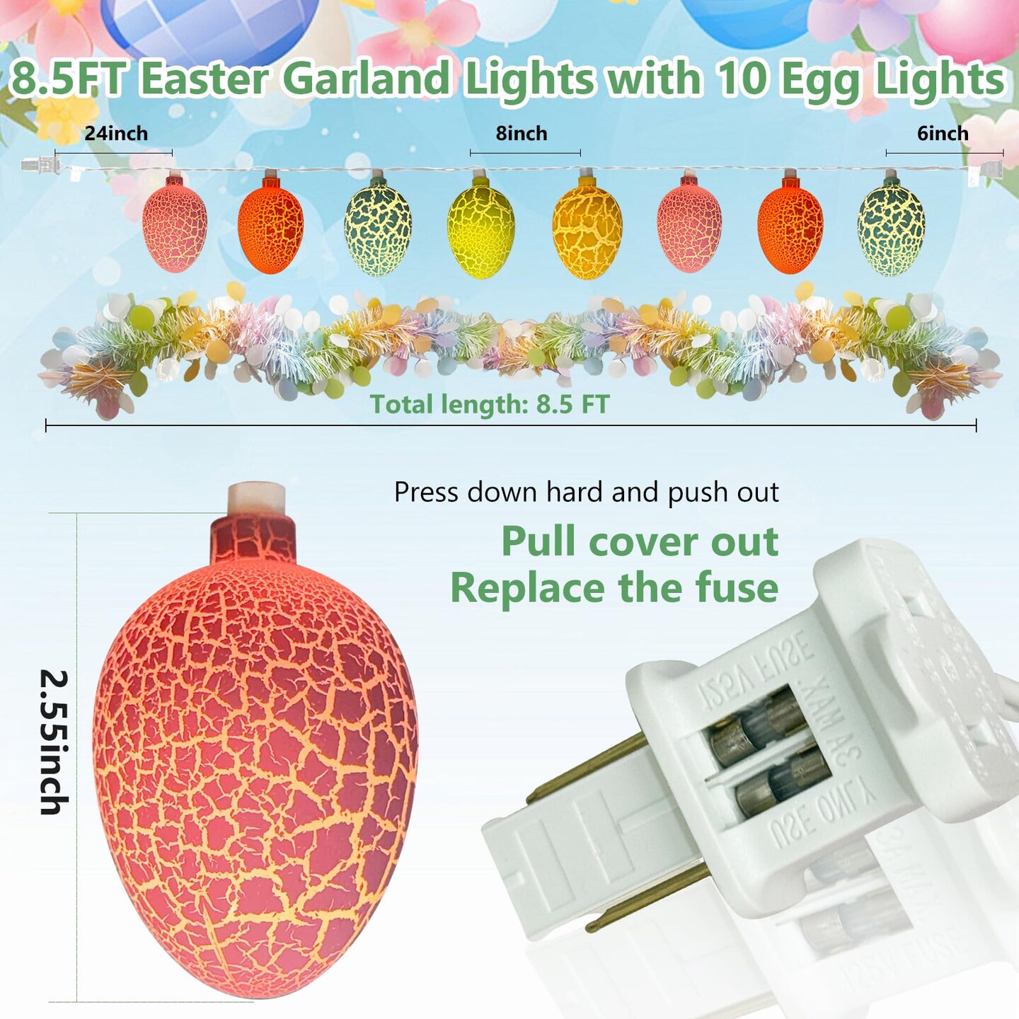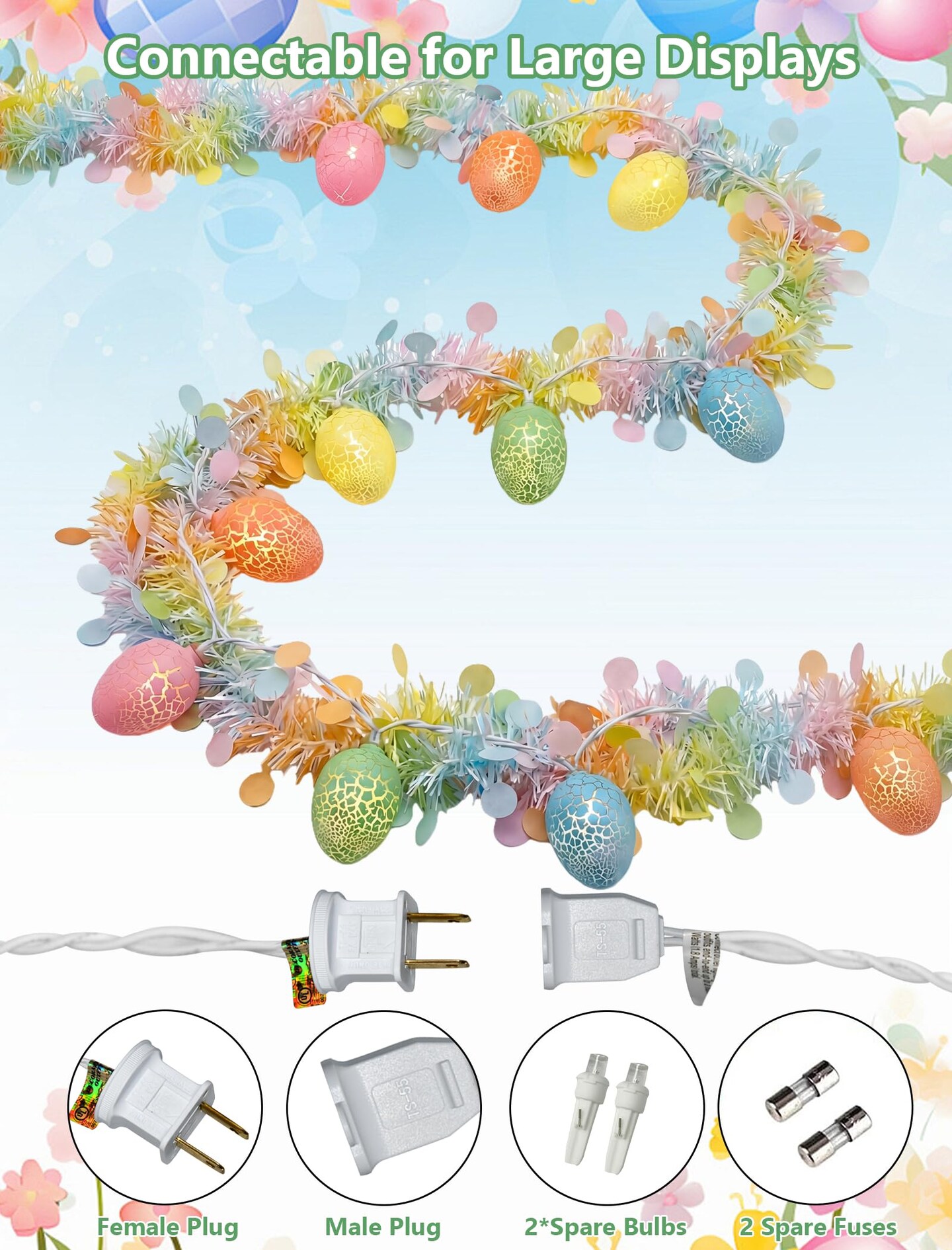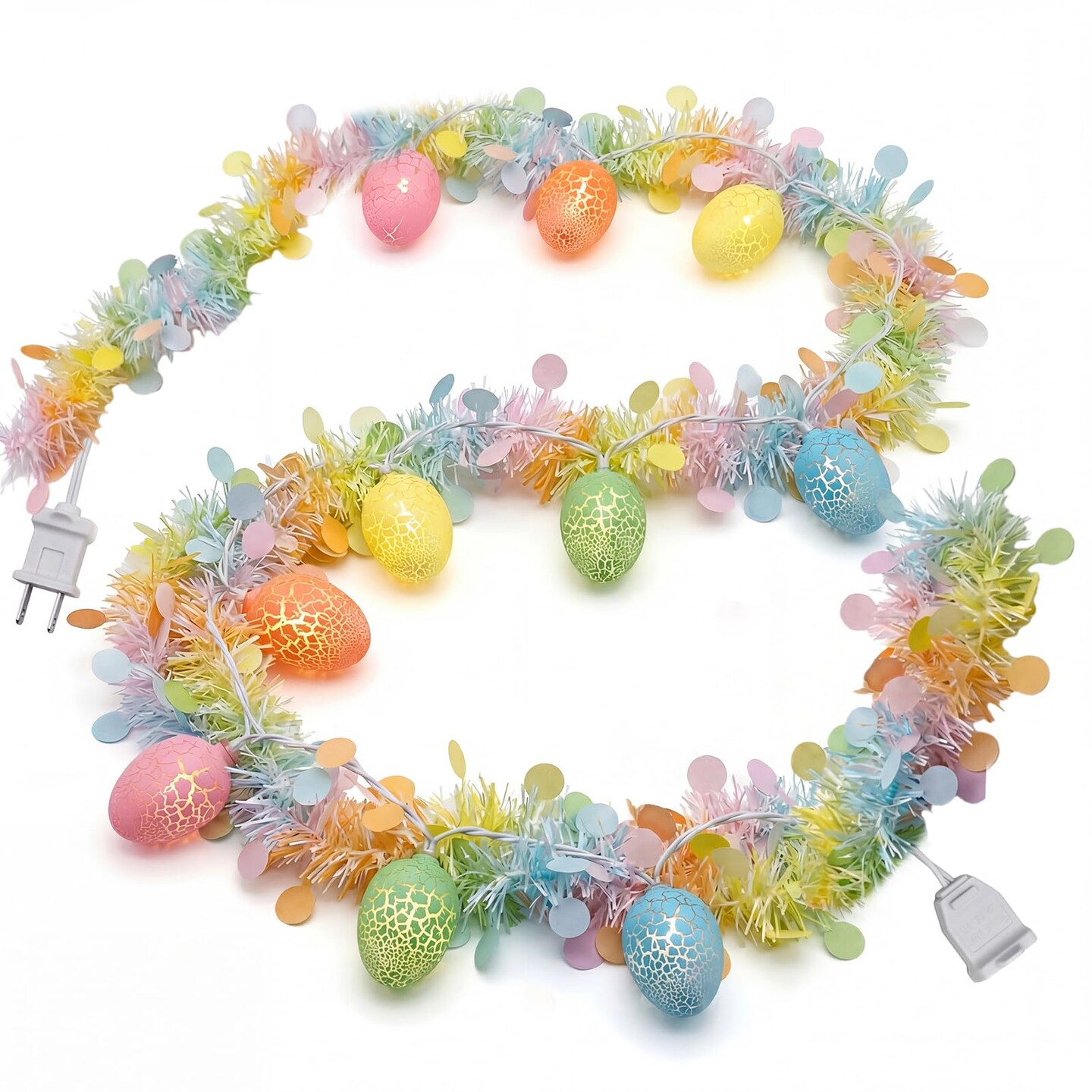 8.5Ft Easter Garland with Lights, Plug in Easter Egg String Lights & Pastel Tinsel Set (White Wire), Connectable Waterproof Indoor Outdoor Decor for Home Mantle Bedroom Party