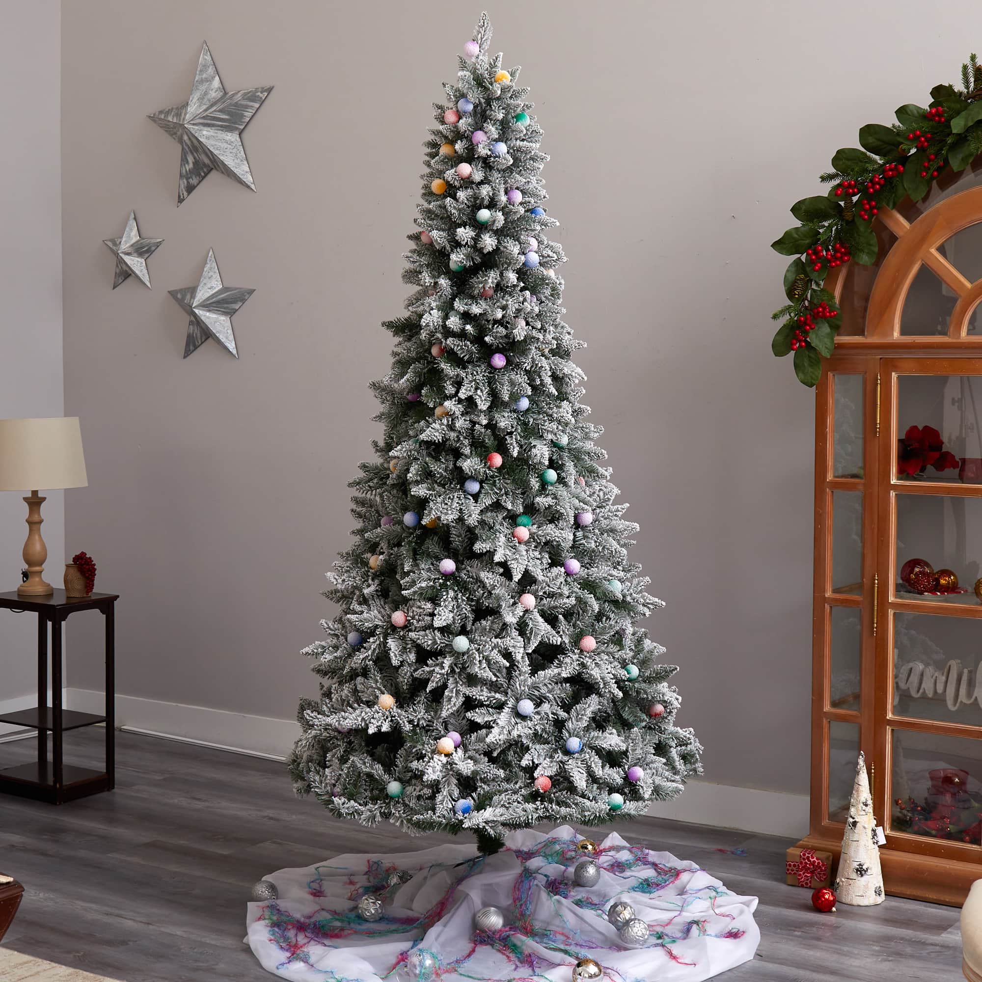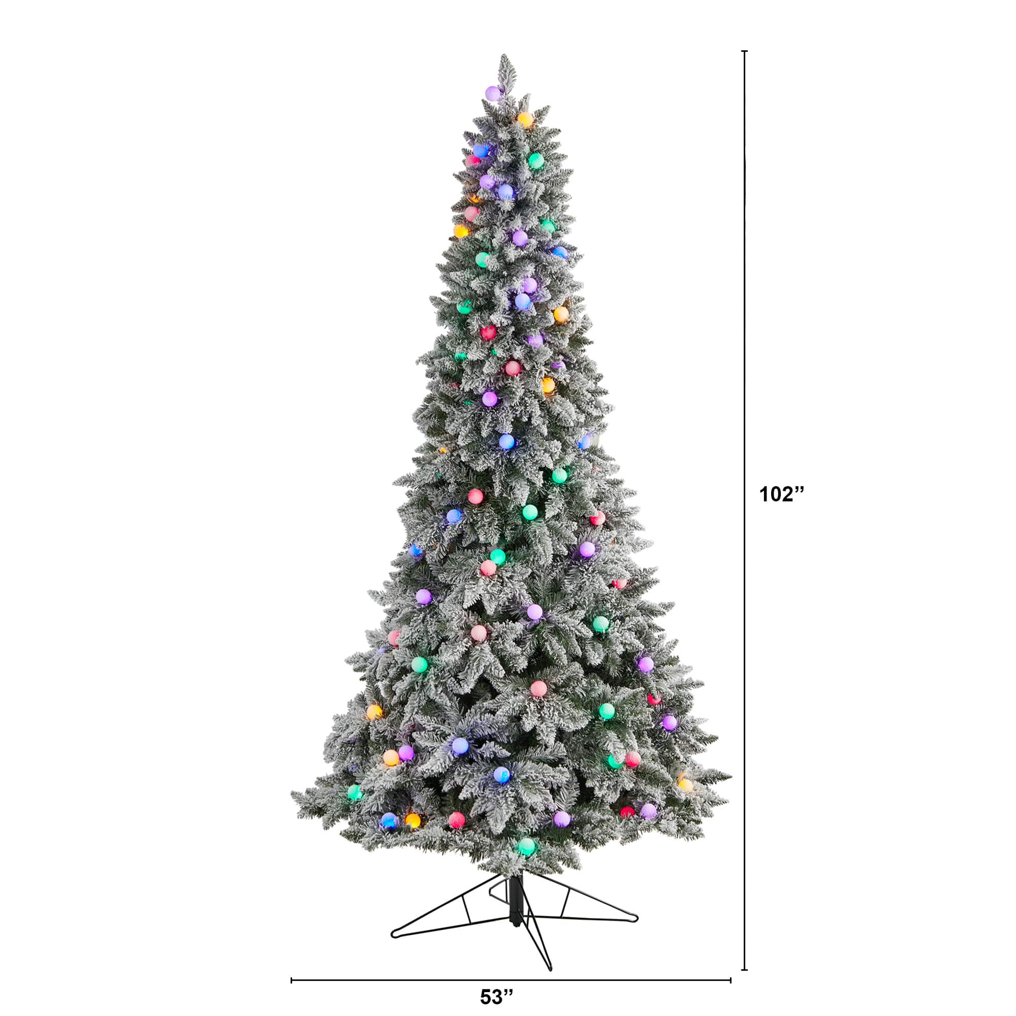 8.5ft. Pre-Lit Flocked British Columbia Mountain Fir Artificial Christmas Tree, Multicolor Globe Bulbs