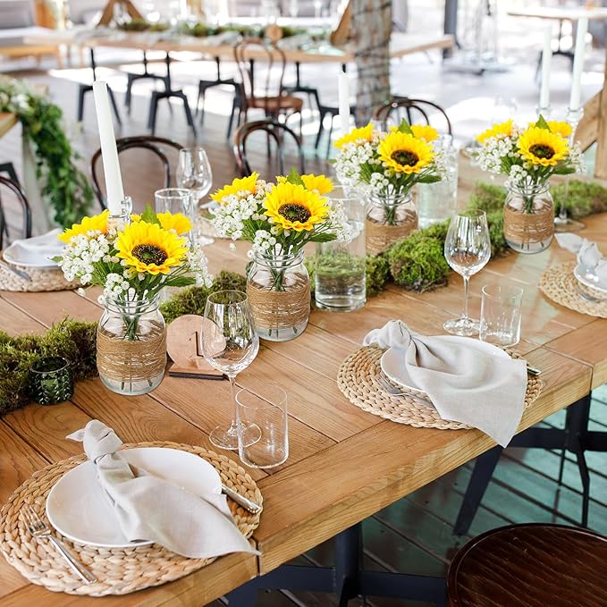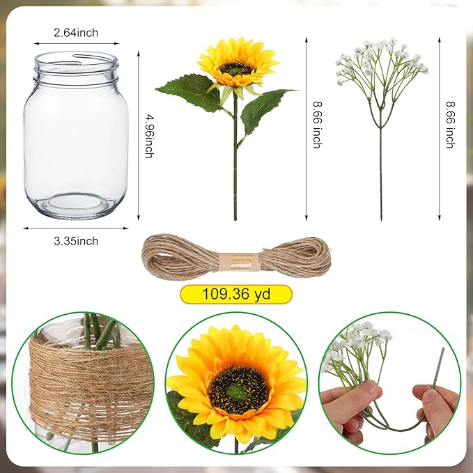 85pcs (12 Set) Sunflower Mason Jar Centerpiece Vases – Faux Floral with Rope, Boho Rustic Table Decorations for Wedding, Bridal Shower, Engagement, Reception & Party