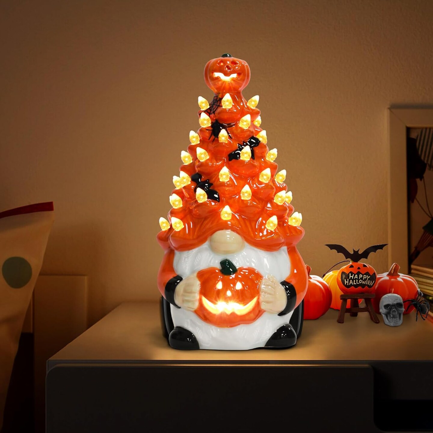 8.6" Light Up Ceramic Gnomes Halloween Tree Tabletop Decor