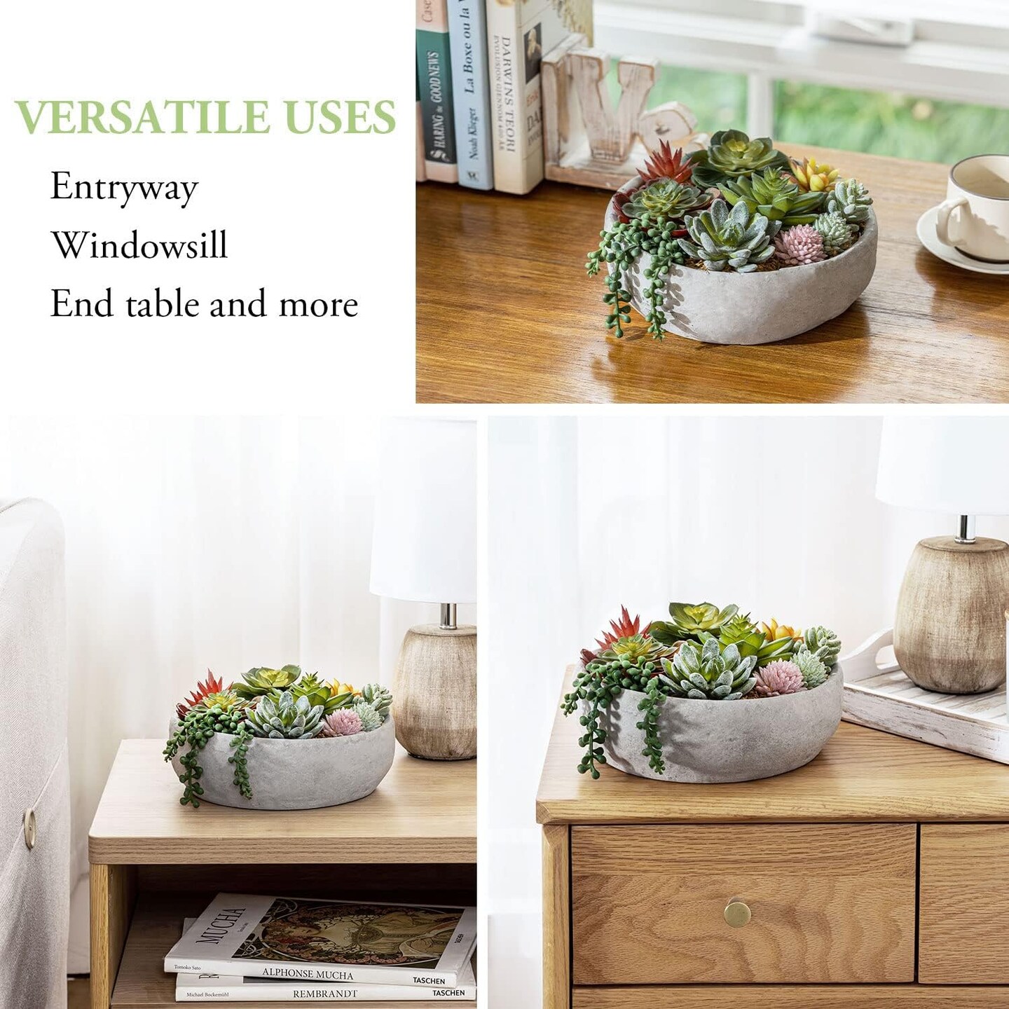 8-Inch Round Modern Artificial Succulent Arrangement in Gray Concrete Bowl – Assorted Faux Mini Succulents Displayed in a Stylish Decorative Planter Pot