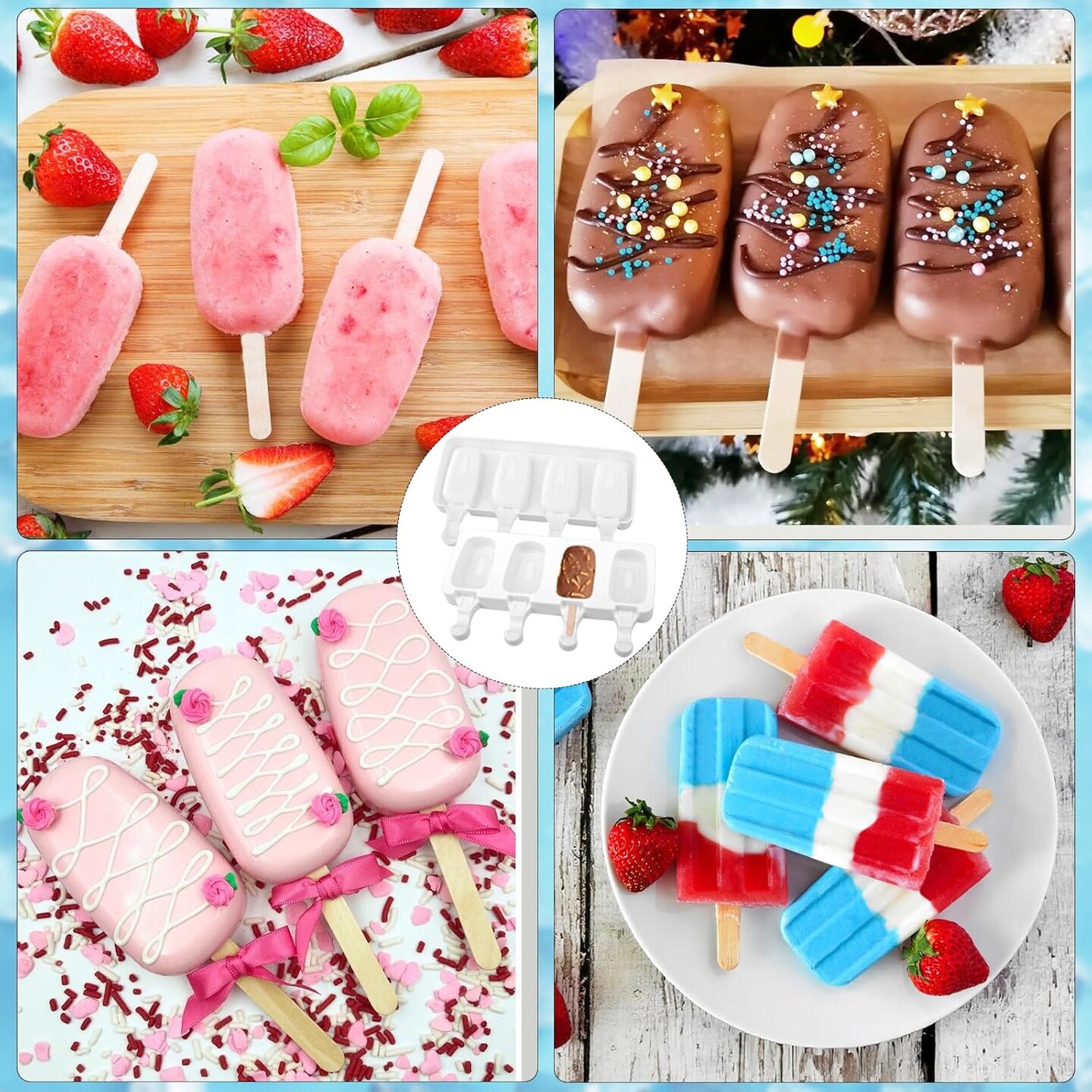 8-Set Silicone Popsicle & Cakesicle Molds with 400 Wooden Sticks – 4-Cavity Reusable Ice Pop & Oval Cake Molds for Kids, DIY Frozen Treats, Easy Release Party Snacks (White)