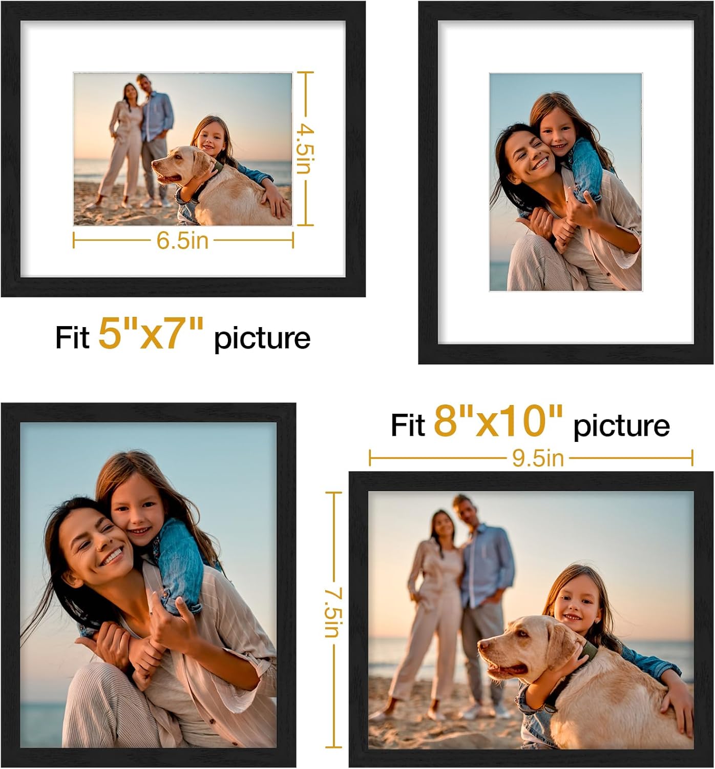 8x10 Picture Frames Set of 4, Display Pictures 5x7 with Mat or 8x10 without Mat, Engineered Wood with Shatter Resistant Plexiglass, Wall Gallery Photo Frames for Wall or Tabletop, Black
