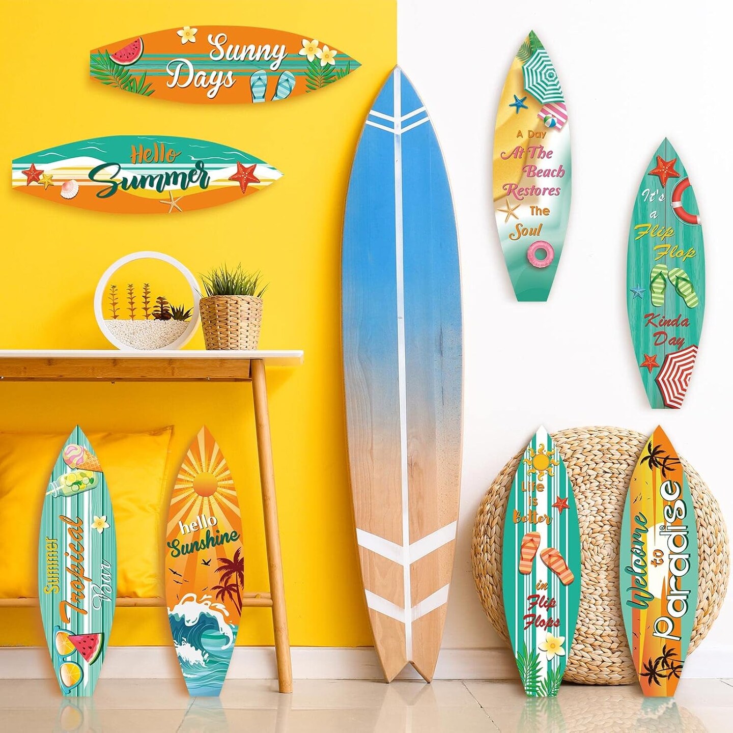 9 Pcs Surfboard Beach Signs Cutouts Paper Wall Decorations Hawaii Party Supplies Tropical Bar Sign Summer Welcome to Paradise Flip Flop Decor for Luau Beach Pool Party